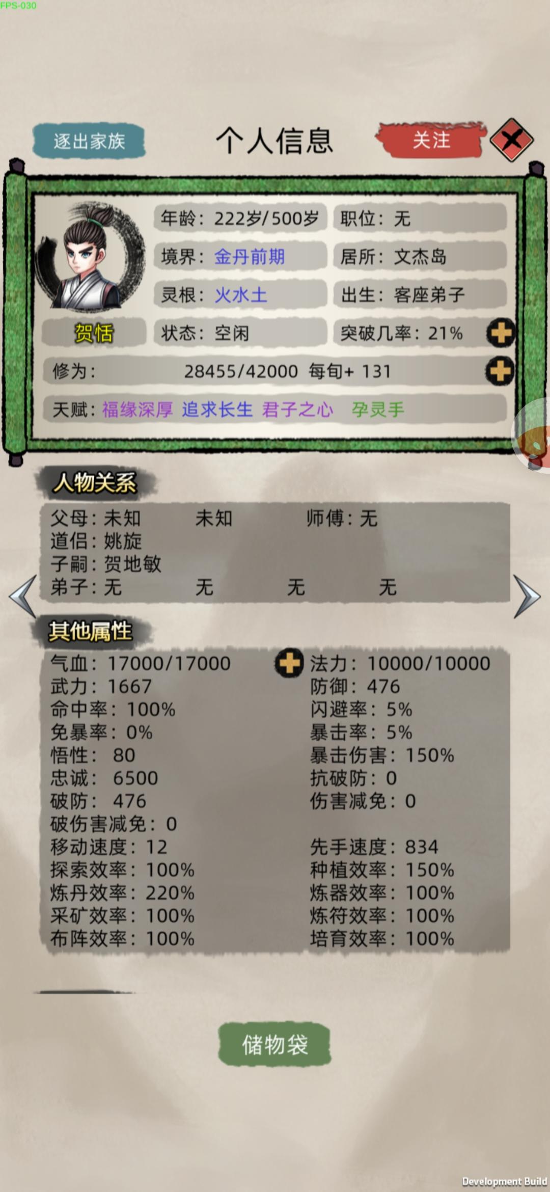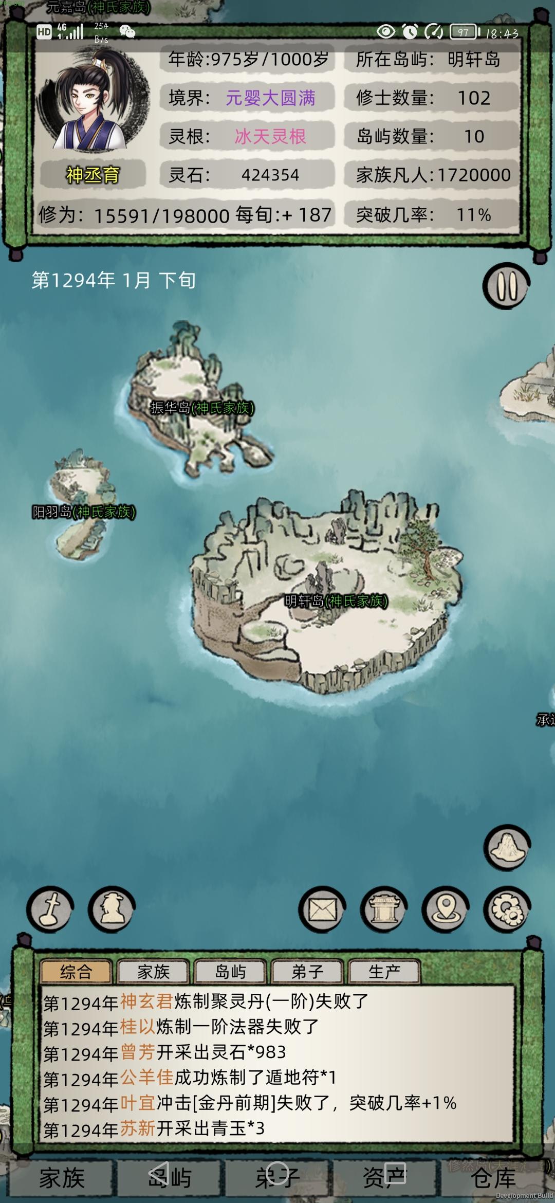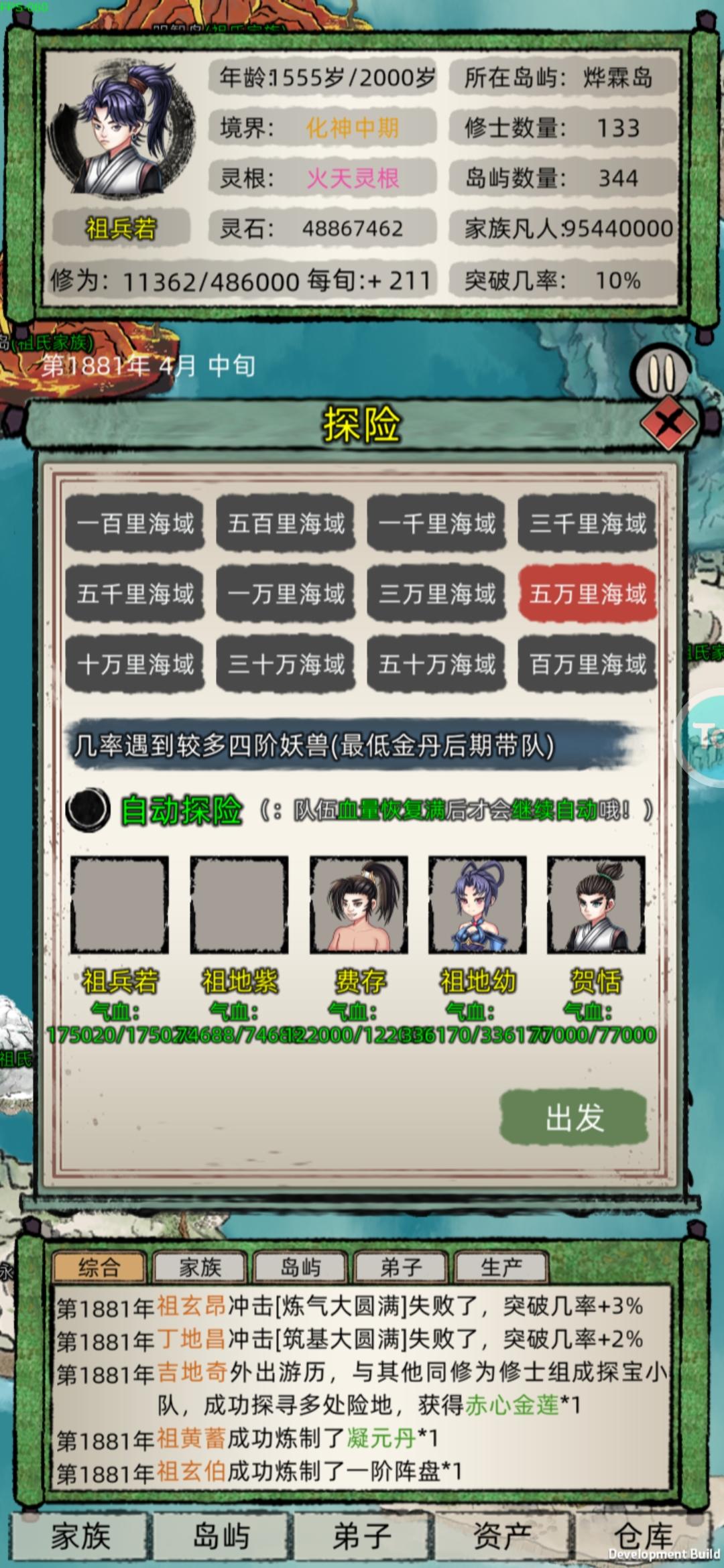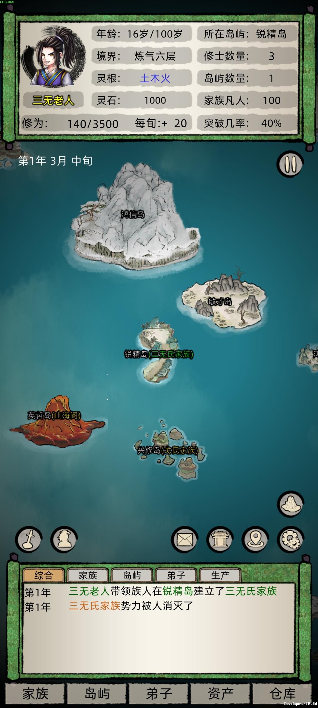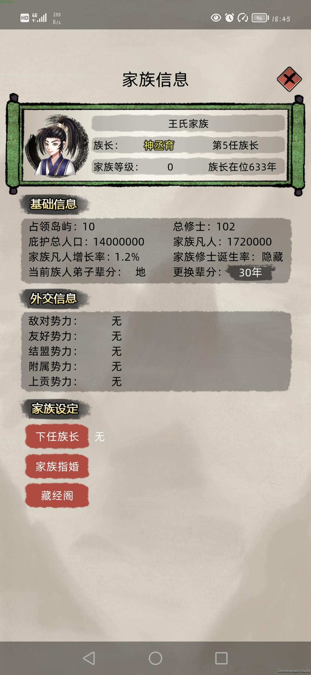 一代:人皇血脉老祖稳定发育苟到金丹,刚打下一座小型岛,搬家过去,便被一元婴家族偷袭,老祖战死,人员退守微型岛。二代:水天灵根苗子接任家主之位,修为筑基后期,撑起一片天,700年的时间发育到元婴中期,化神无望,好在家族麒麟儿后来居上,率先元婴后期。但就在此时,附近火岛上的化神势力上清宫来袭,家主死战不屈,另一天灵根也夭折,只剩麒麟儿一人临危受命,家族断代严重。三代:麒麟儿继任,终在1000年踏入