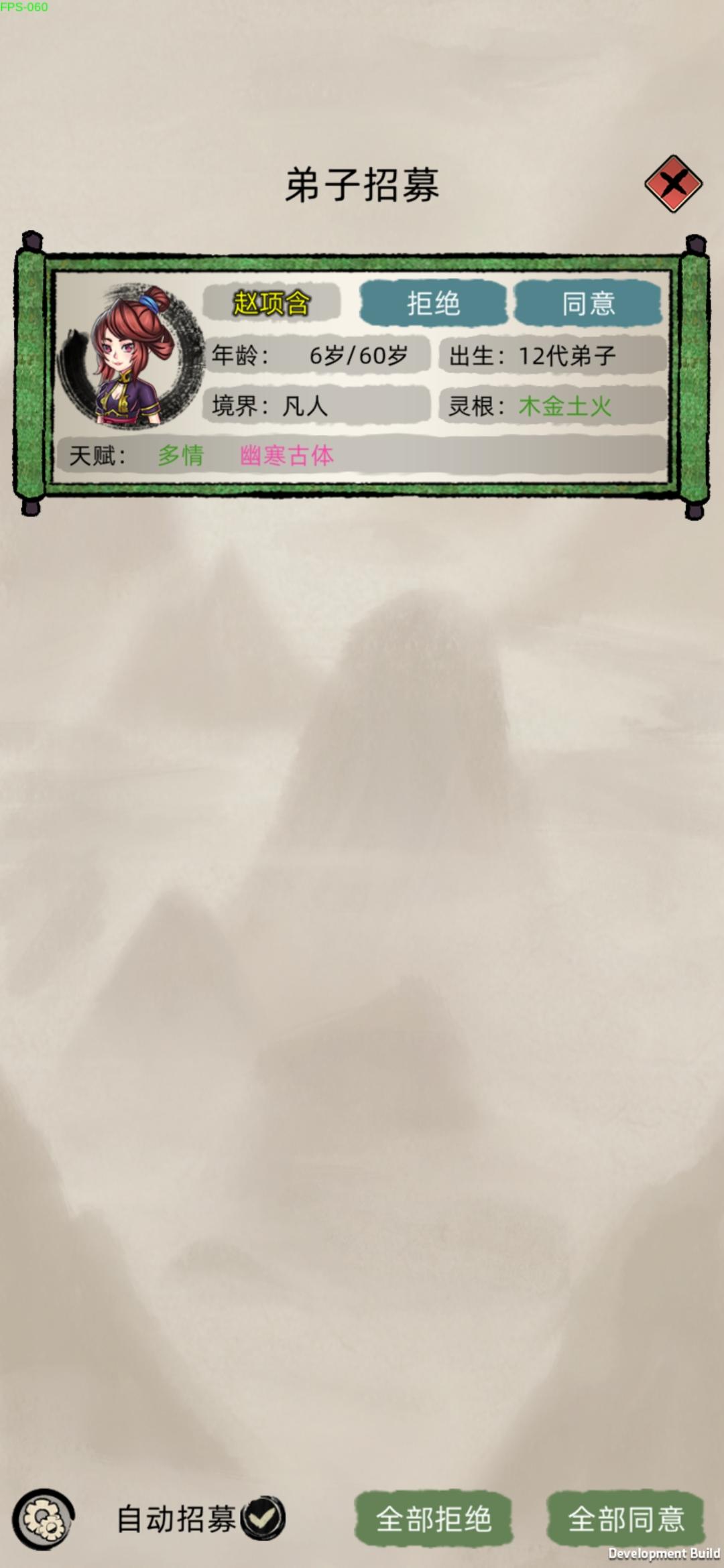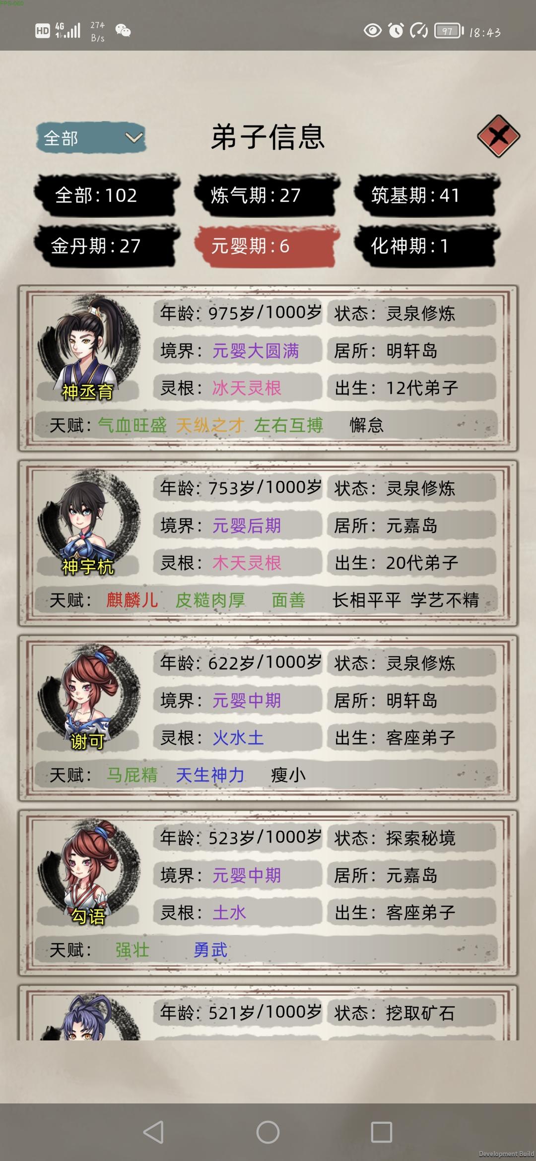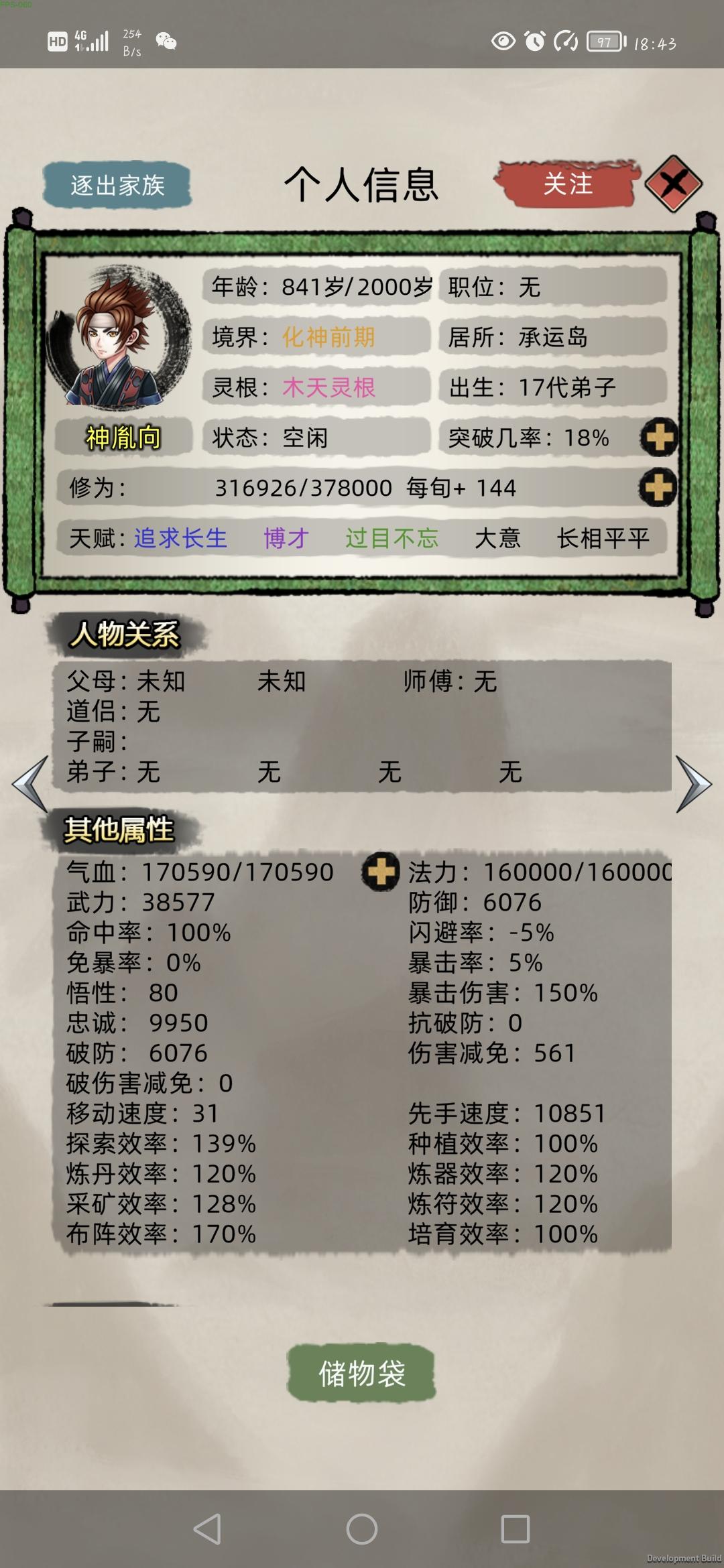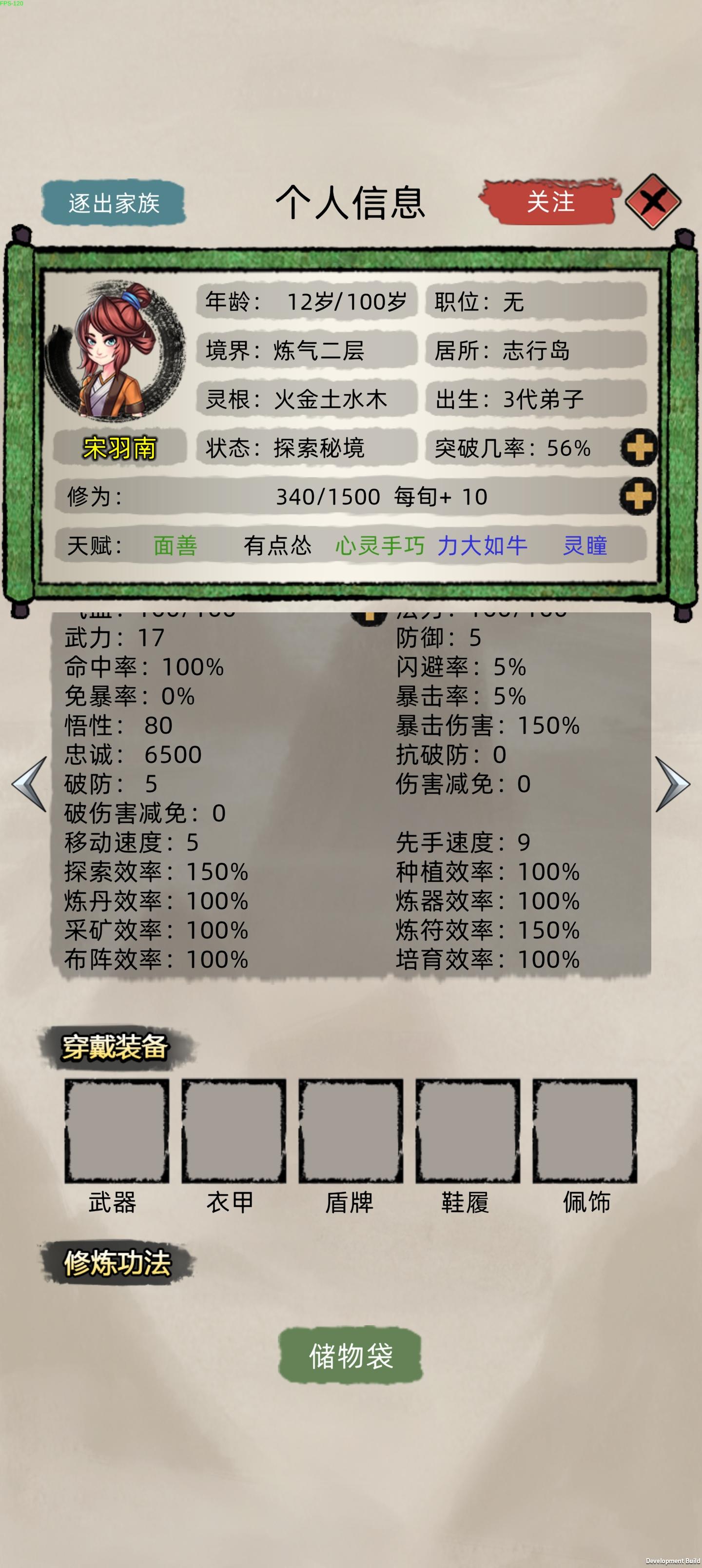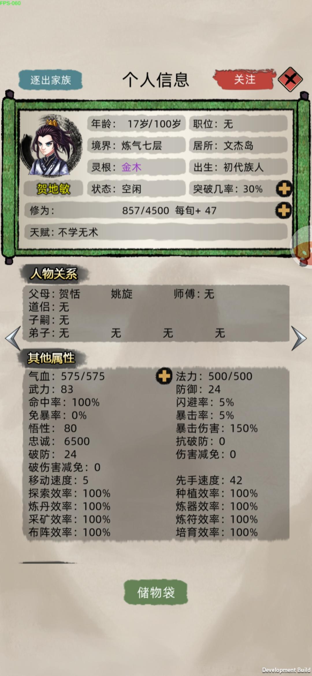 一代:人皇血脉老祖稳定发育苟到金丹,刚打下一座小型岛,搬家过去,便被一元婴家族偷袭,老祖战死,人员退守微型岛。二代:水天灵根苗子接任家主之位,修为筑基后期,撑起一片天,700年的时间发育到元婴中期,化神无望,好在家族麒麟儿后来居上,率先元婴后期。但就在此时,附近火岛上的化神势力上清宫来袭,家主死战不屈,另一天灵根也夭折,只剩麒麟儿一人临危受命,家族断代严重。三代:麒麟儿继任,终在1000年踏入
