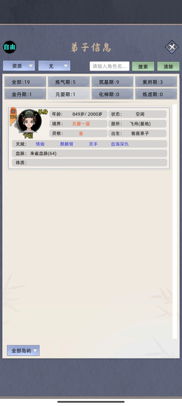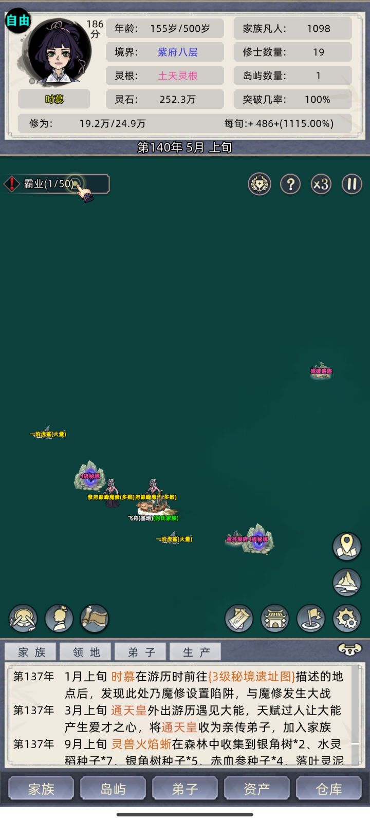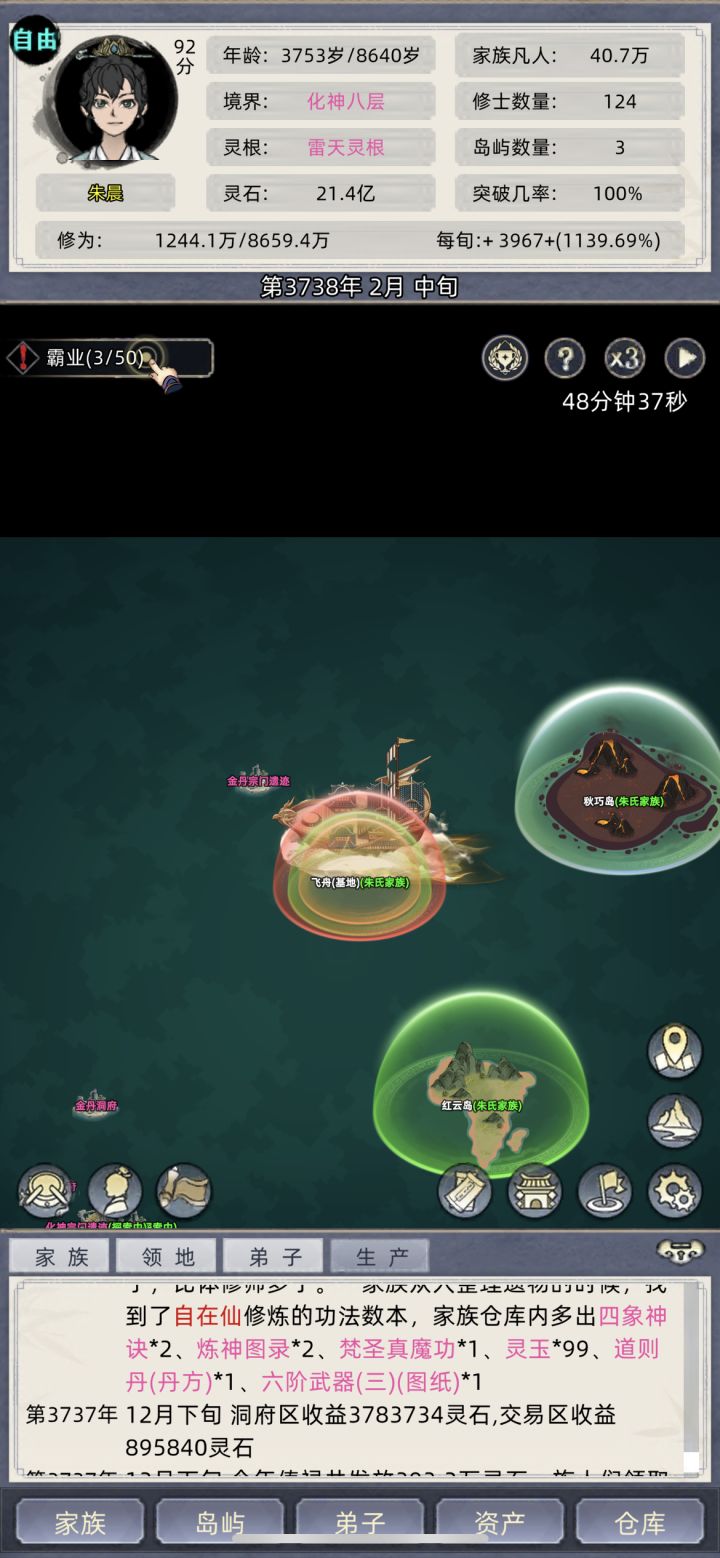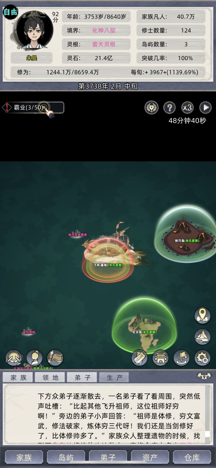 找大岛刷个盾直接A拆了灵脉跑路回家升级我们的小岛灵脉出天道台上聚灵阵 一直三倍速 中间忘了截图了 元婴期就可以出去拿几个大岛灵脉了中间还偷了邪派老家 拆完灵脉我们直接回家升级灵脉苟起来化神期在出去拆一波 我是没要弟子的 就老祖一个人打天下 别看我14个岛 全是拆了灵脉的 中途就被元婴打过 元婴打我的时候我都化神了就这样 我都快苟到炼虚了