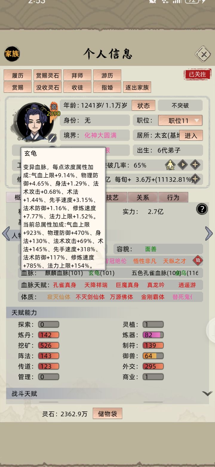 #游戏杂谈 #新手攻略 #修仙家族模拟器 1弟子功法自学不了的话,可以调成0~5000就行了 2六血脉怎么配,其实也很简单的,先勾选三条血脉,保存退出,然后再勾选另外三条(注,最新版本已废,卡不了了) 3开局该选什么玩,这取决于你玩哪个模式,自由模式个人建议宝物全选了,选个名人帖里面的名人当族长,修仙和家族模式的话个人更喜欢登仙台,问道塔,血脉池这三样,也可以通过祠堂弄到另外三件传家宝看