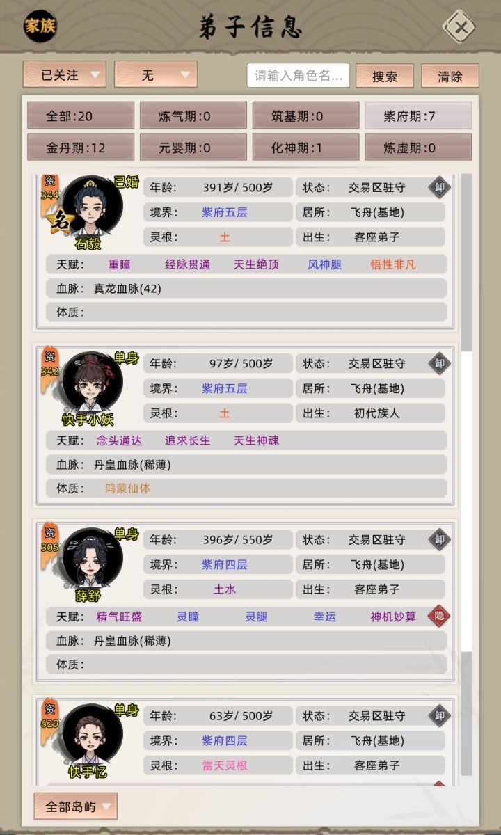 开局天赋选择龙吟之体 随机红色,家族选择富饶家族 稀世功法 元婴长老,法宝选择大荒塔 小绿瓶,进入游戏建造,天道台使用换灵丹刷档需要的灵根(灵根属性可以按照自己的需求,我比较推荐木灵根)然后购买天赋丹刷档(个人比较推荐加修炼速度的粉体前期作用不大)然后派遣元婴长老去占领特大岛,两个微岛 小岛 中岛 大岛,设置自动派遣每个岛屿12个炼气,然后天道台购买魂灯让家主叠满1到5级灵泉(80修炼速度)然后通