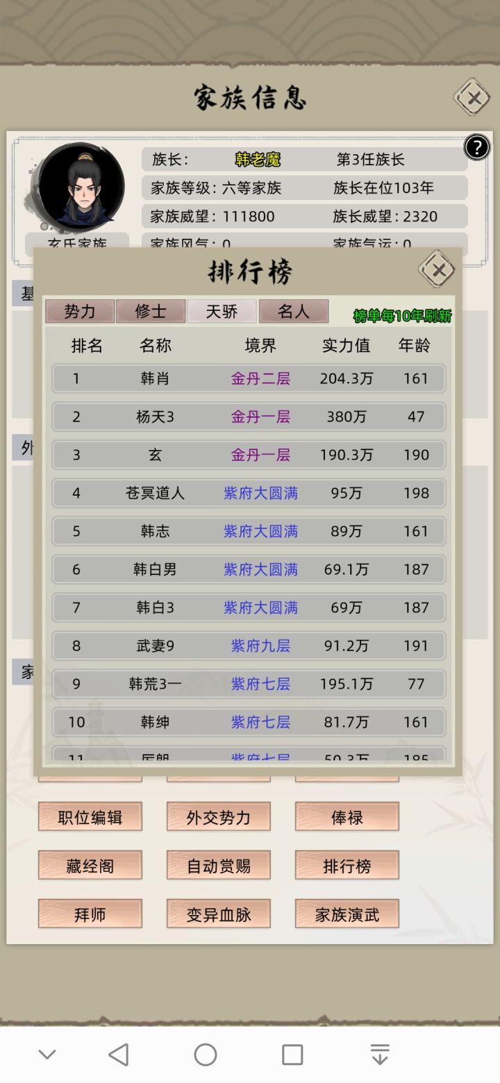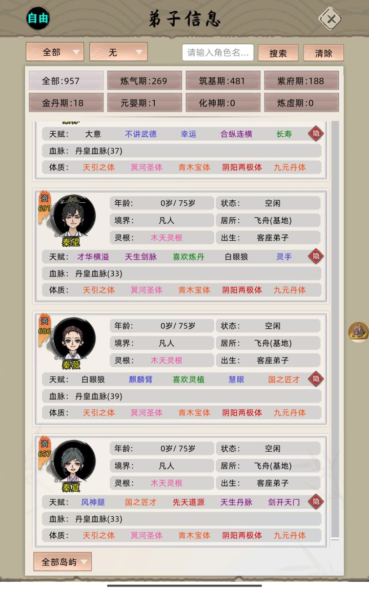 本帖会写一些萌新可能会遇到的常见问题。或者我自己遇见的常见问题。如果有什么问题可以留言。一、境界类1、练气气血衰败怎么办?80岁以后变成了0?(1)安排游历有时候侥幸突破(2)直接吃筑基丹2、练气-紫府除了天灵根其他渡劫易死,怎么降低死亡概率?(1)装备带更高一阶(2)学习气血类的功法,比如天罗,血灵,龙蟒等3、什么境界才能创更高一阶的功法?(1)该境界的大圆满4、五阶功法怎么