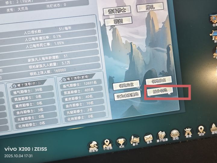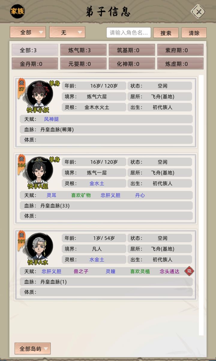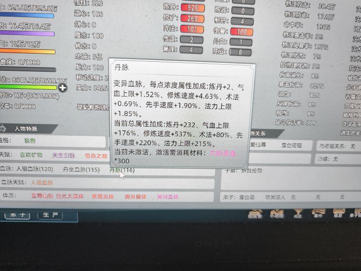 赏赐给弟子300六阶灵血,占领一个岛,把弟子放到岛上,拆分领地,然后等一年电脑会自动激活变异血脉,上交弟子,弟子必须是化神期才行,激活后会卡bug导致本来增加200%的血脉属性变成400%,保存重进就没了,不重进可以一直用,比如2000+挖矿,2000+炼丹轻轻松松