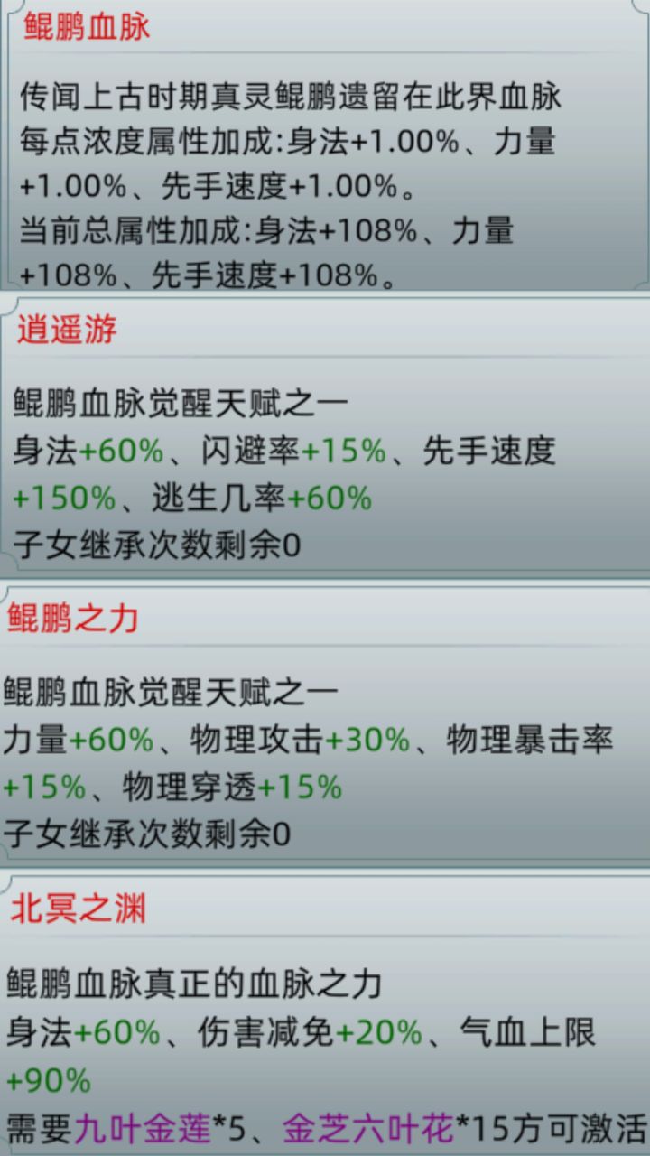 个人观点,仅供参考变异血脉由很多小点数组成,图3.4.5点数加的数值高低是随机的,点数多少是随机的变异血脉跟人物属性有关人物啥个属性高,血脉就会偏向于那个属性,那血脉大部点数加的属性都是加那个属性的变异血脉不是人物数值越高越好图1是六血觉醒,带了全部装备的图2是没有觉醒,只带了攻击仙器的单个属性高最好,全高了血脉反而杂