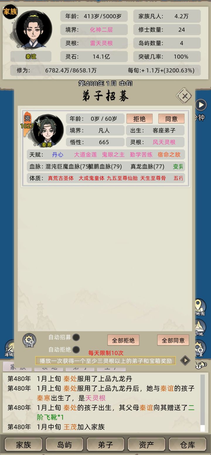 影龙鱼80%灵根sl多次却无法出,可以使用天道台获取换灵丹,选择冰天灵根,然后sl10道心性格或用补心诀,气运20可以用登仙台来补,操作简单去掉了很多sl的地方!图片为成功的,开局一定要选择一堆灵兽蛋