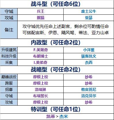 游戏内15个紫色副官都已给大家带来非常详细的介绍啦~小编今天给大家带来关于不同情况的副官搭配推荐。搭配介绍1、战斗型:优先任命已有紫色副官,若紫色副官不足6位,可以上任相应的蓝色副官。①守城:优先任命兵王兵王的技能只有在己方防守战斗才会触发。在守城时需留意,战略型副官可以任命布瑞警长、洛克贝尔,可以按百分比增加医院容纳上限。②攻城:优先任命熊猫杰克与兵王同理,熊猫的技能只有在己方攻