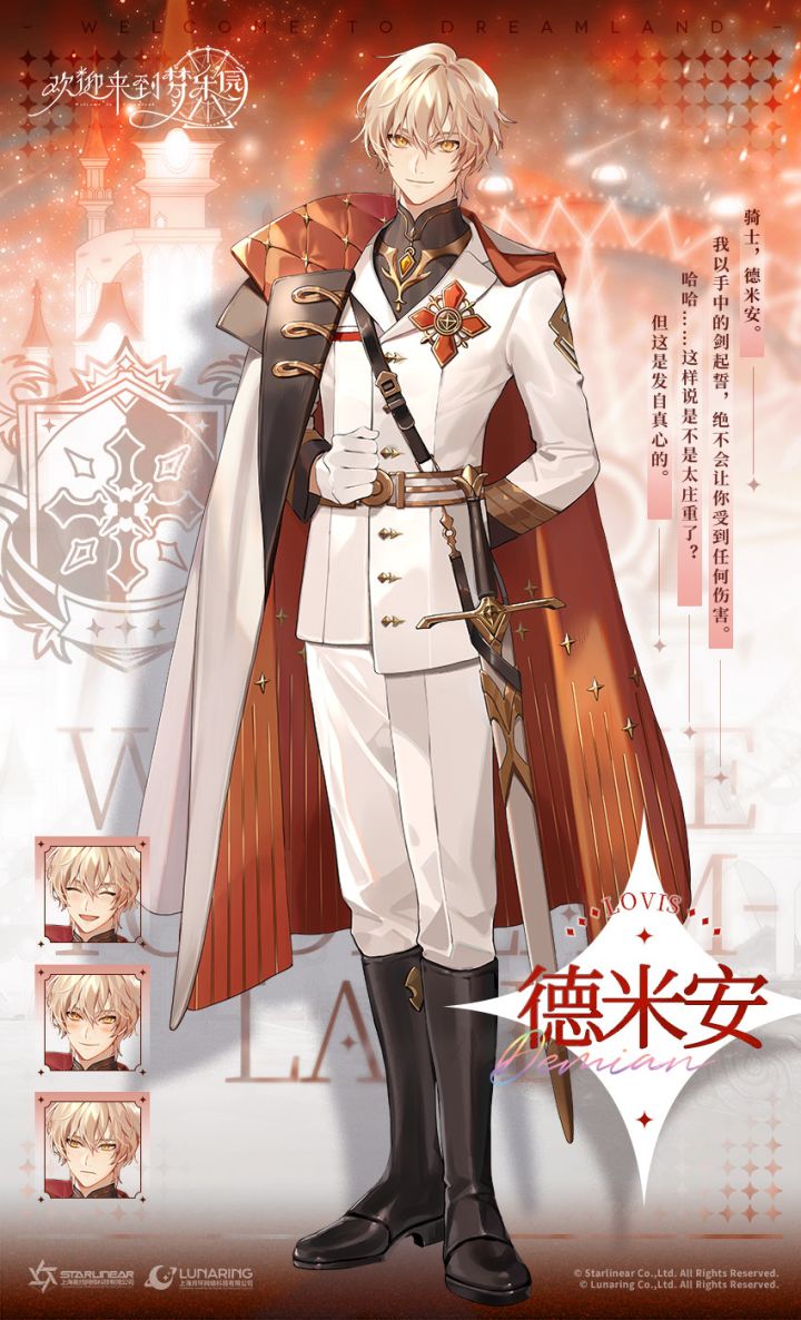 ⭐角色丨德米安“骑士,德米安。我以手中的剑起誓,绝不会让你受到任何伤害。”梦乐园收到了一份新的面试登记卡,本次前来面试的是拂晓骑士团的首领德米安,同时他也是洛维斯的王子。他年轻有为,但从不骄傲,待人始终温和有礼。他虽然拥有强大的力量,但绝对不会滥用,是世人眼里完美的王子殿下——尽管他也有不擅长的事情。⭐欢迎关注我们的官方账号,获取更多新鲜资讯。官方微博:官方微信:欢迎来到梦乐园官方3群