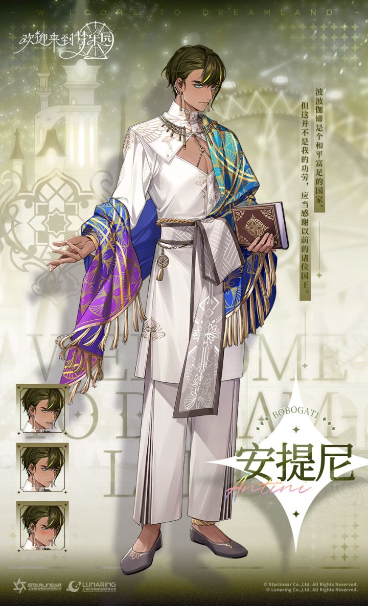 ✨8月30日,全新主线章节「轻曳的砂砾」即将开启!【波波伽谛·独家秘闻】⭐角色丨安提尼 [雾缈莲池]“波波伽谛是个和平富足的国家。但这并不是我的功劳,应当感谢以前的诸位国王。”中配CV:史泽鲲日配CV:岛崎信长——————年轻而谦逊的波波伽谛国王,虽然担任国王的时间并不长,但非常受民众爱戴。每日忙碌于国家事务,十分有责任心,一年里几乎从不休息。不过性格中似乎有非常自卑的一面,在情感上