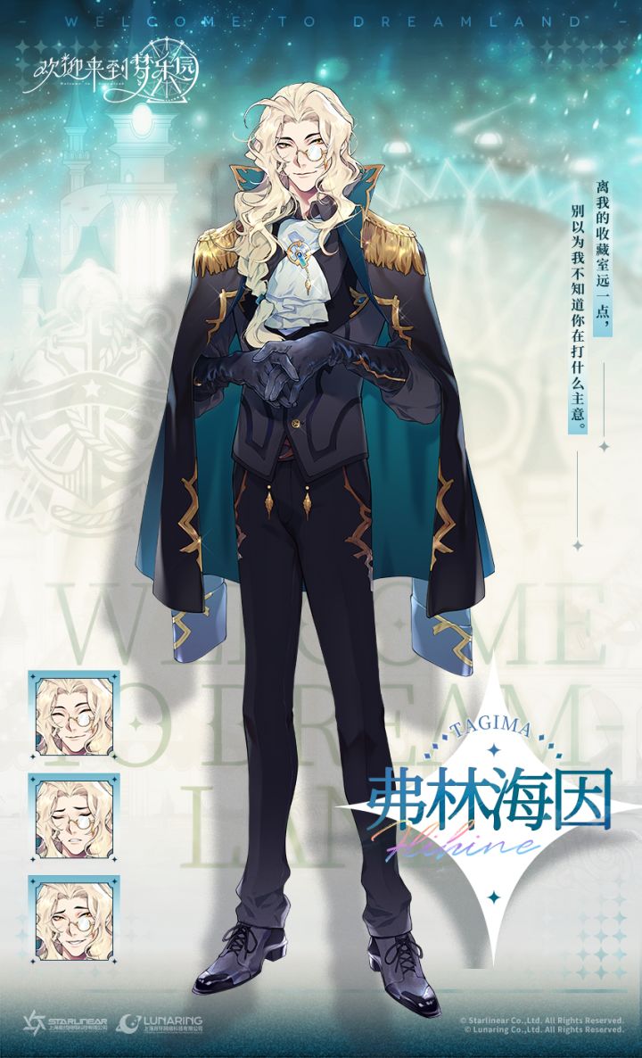 ⭐角色丨弗林海因“离我的收藏室远一点,别以为我不知道你在打什么主意。”在充满海洋与商业气息的塔吉玛,许多人拥有无与伦比的经商天赋。不过要论商务谈判能力,可能很少有人能胜过弗林海因。这个拥有一头柔软金发的男人,当他藏在镜片后狡黠的眼睛望向你时,请小心。⭐欢迎关注我们的官方账号,获取更多新鲜资讯。官方微博:官网预约:官方微信:欢迎来到梦乐园官方4群:514056809