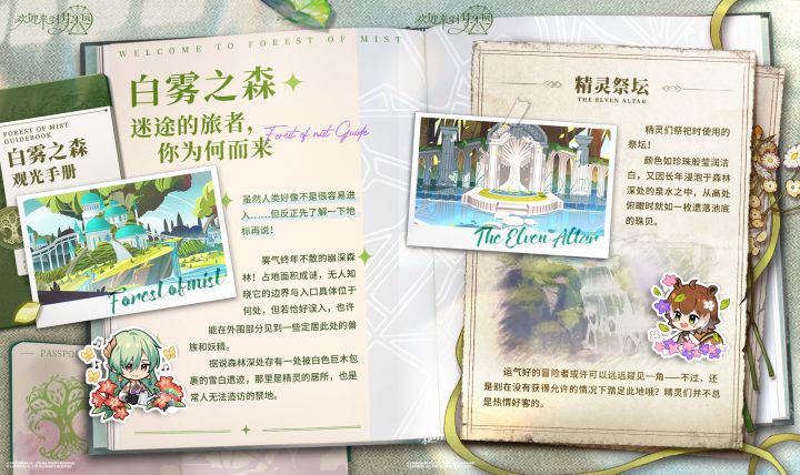 ⭐白雾之森雾气终年不散的幽深森林!据说森林深处存有一处被白色巨木包裹的雪白遗迹,那里是精灵的居所,也是常人无法造访的禁地。⭐精灵祭坛精灵们祭祀时使用的祭坛!颜色如珍珠般莹润洁白,又因长年浸泡于森林深处的泉水之中,从高处俯瞰时就如一枚遗落池底的珠贝。⭐永盛花原开满了鲜花的广阔花原!具体位置与占地面积都成谜,盛产精灵、妖精、兽族都十分喜爱的花蜜与晨露。白雾之森不参与外界纷争,于此居住的精灵