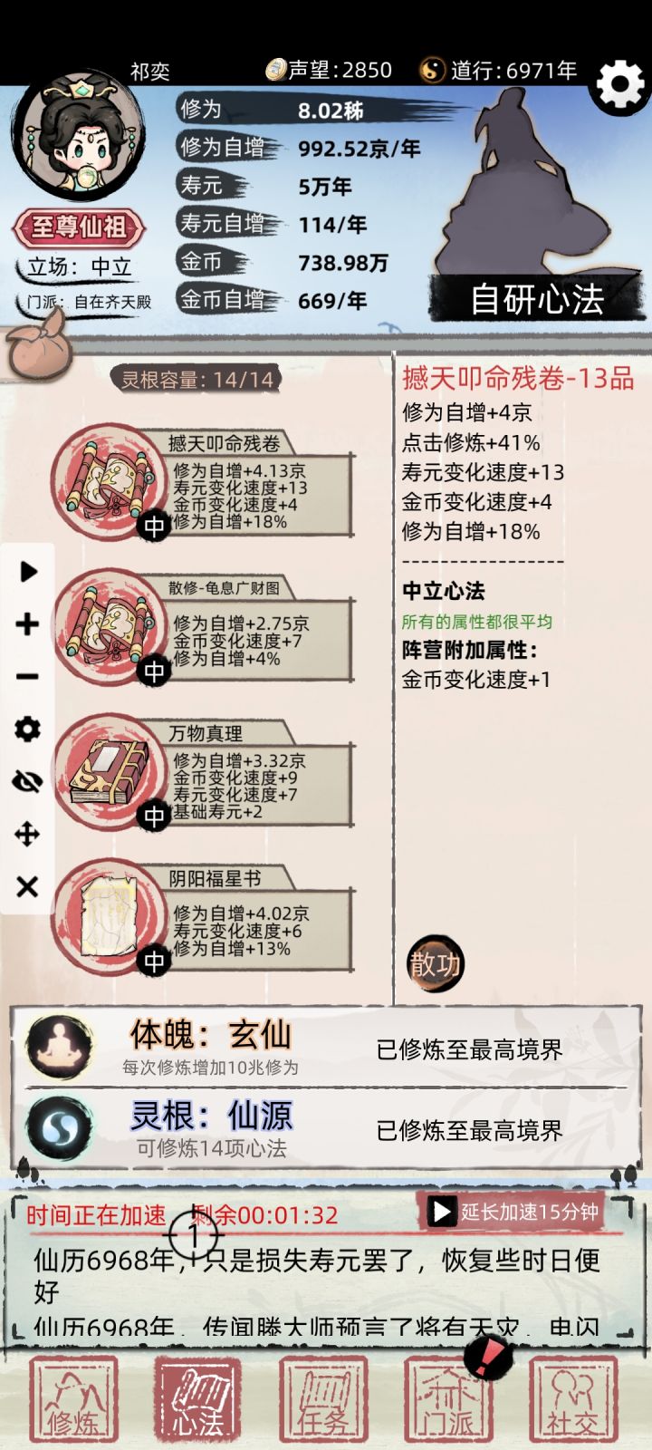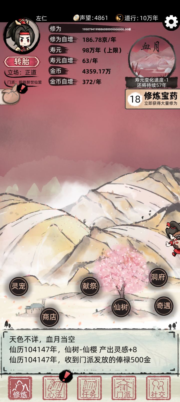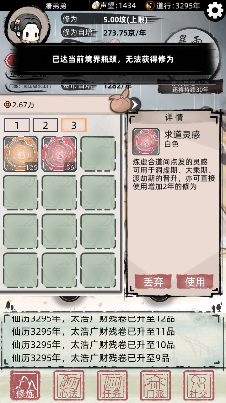 第四部:正派的心法,升级可以自增钱和寿命,最好选择词条有自增钱的功法