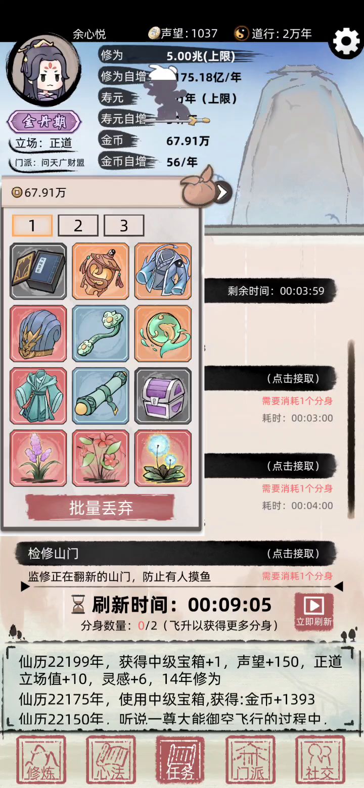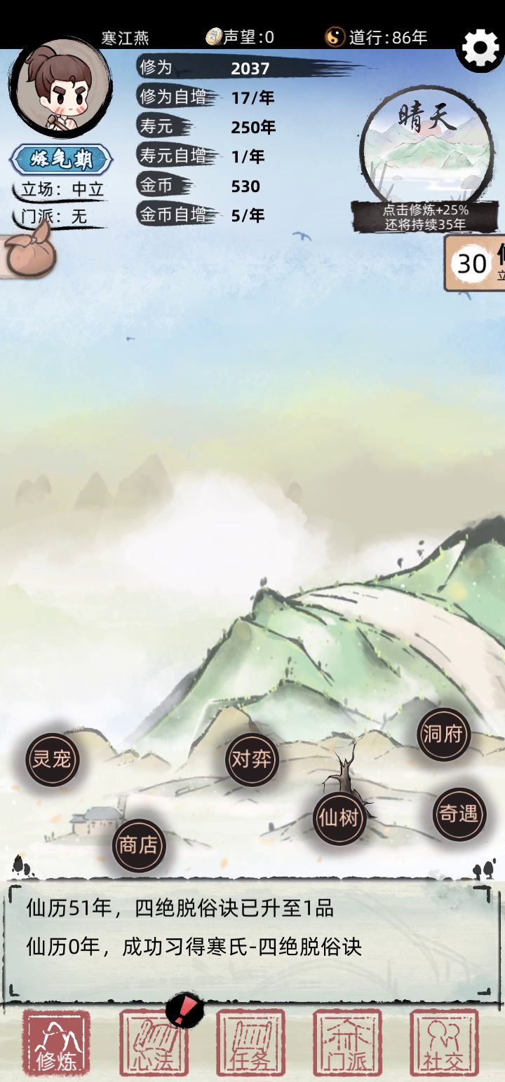 肝了一天 好不容易除了出了点击倍率神器 结果带上后修为不自动增长了 弃坑了 浪费老子时间