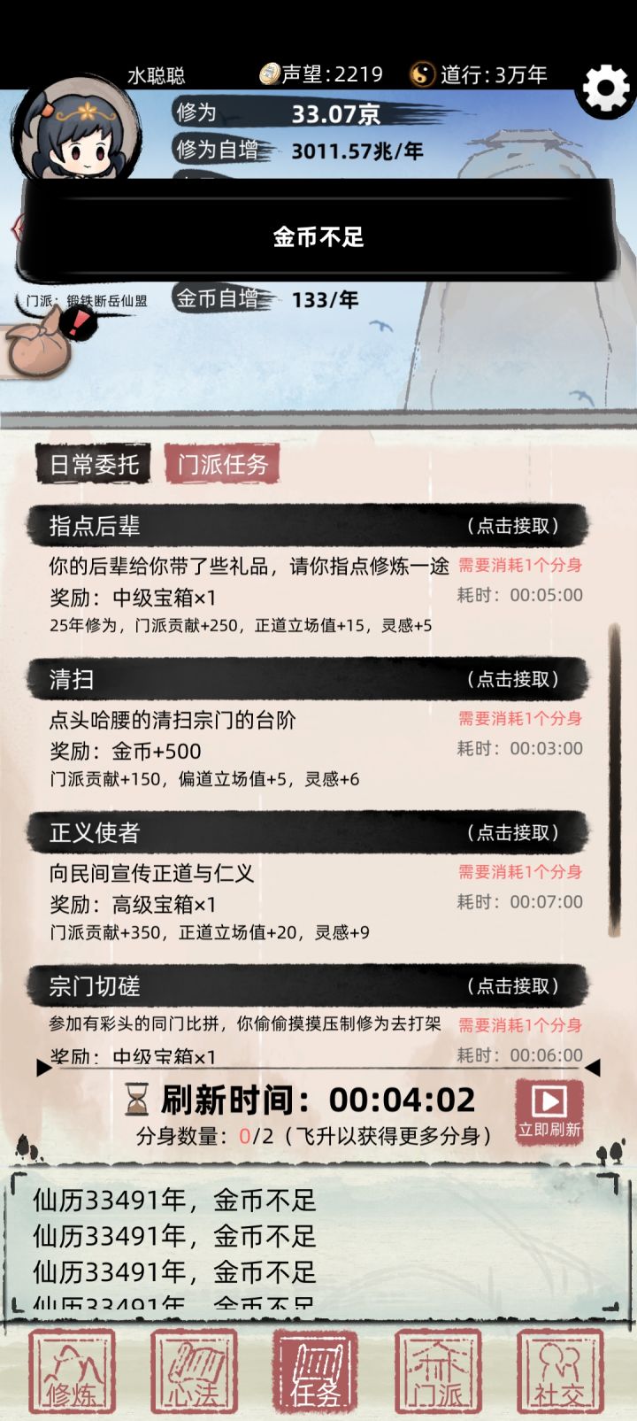 后台挂机就不会加修为了,重登之后也没加上,还有一个bug,忘了是啥来着