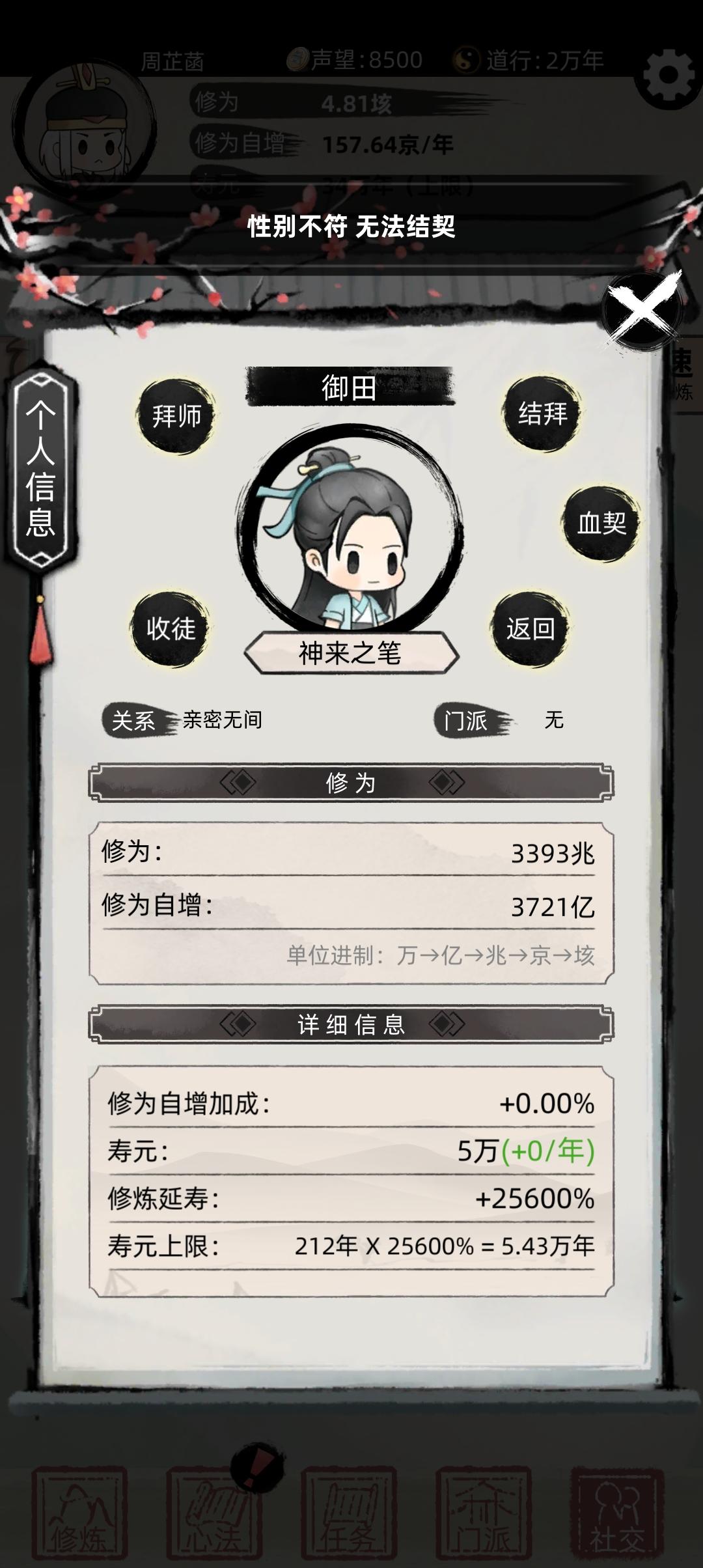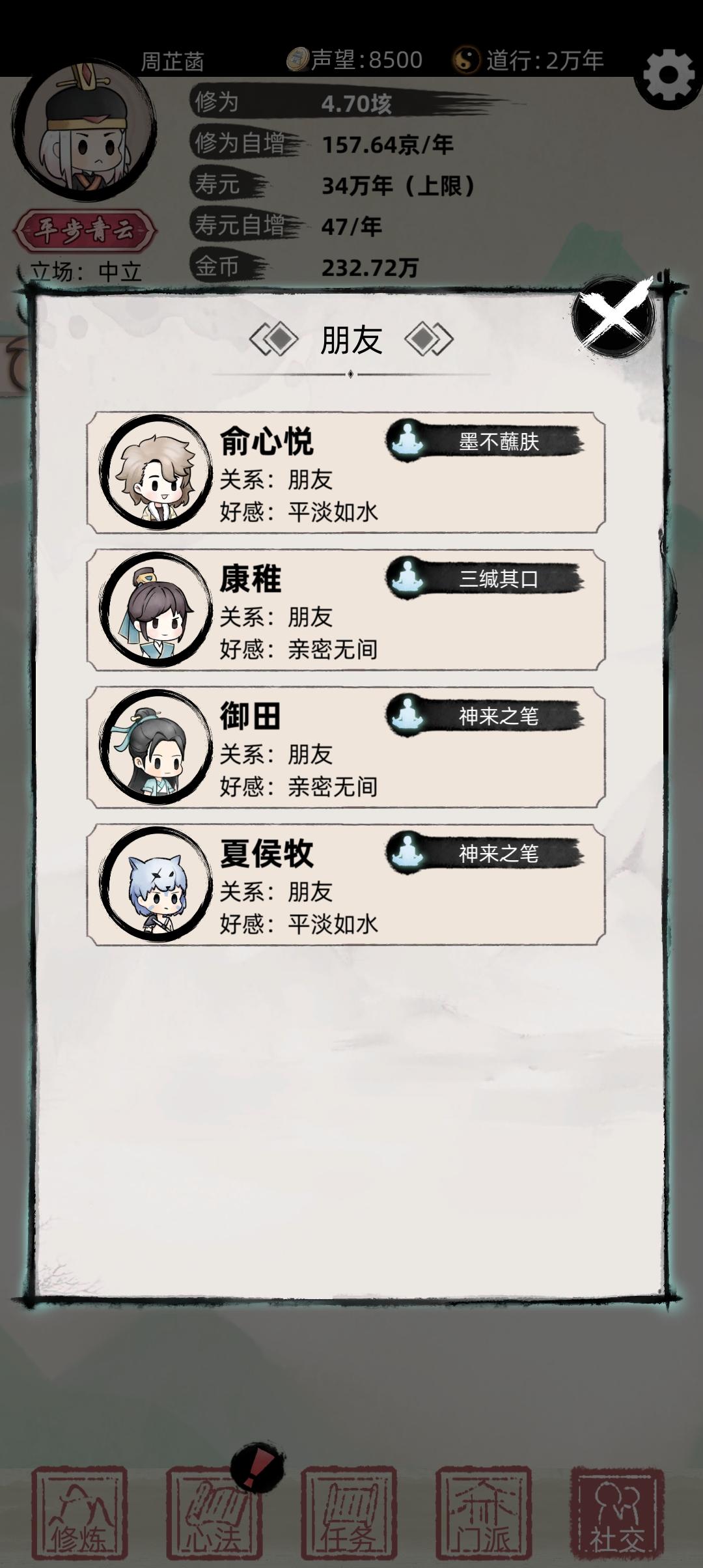 玩了也有四五天了,游戏整体还可以,可玩性还行,渡劫,养殖,法宝,功法,灵宠,门派等等都一应俱全,这里提几点改善意见:1.好友社交遇到的好友怎么都是男的??我玩到现在至今没出道侣,是真心想让我一心求道的意思?那这个道侣栏又有何用呢。2.好友渡劫失败等原因身死道消很正常,但是在好友栏里面能否加上三个改善点,一个是好友死了就往下面放放,把活人放在上面,不然看了很难受啊,第二个是能否加上死好友删除功能