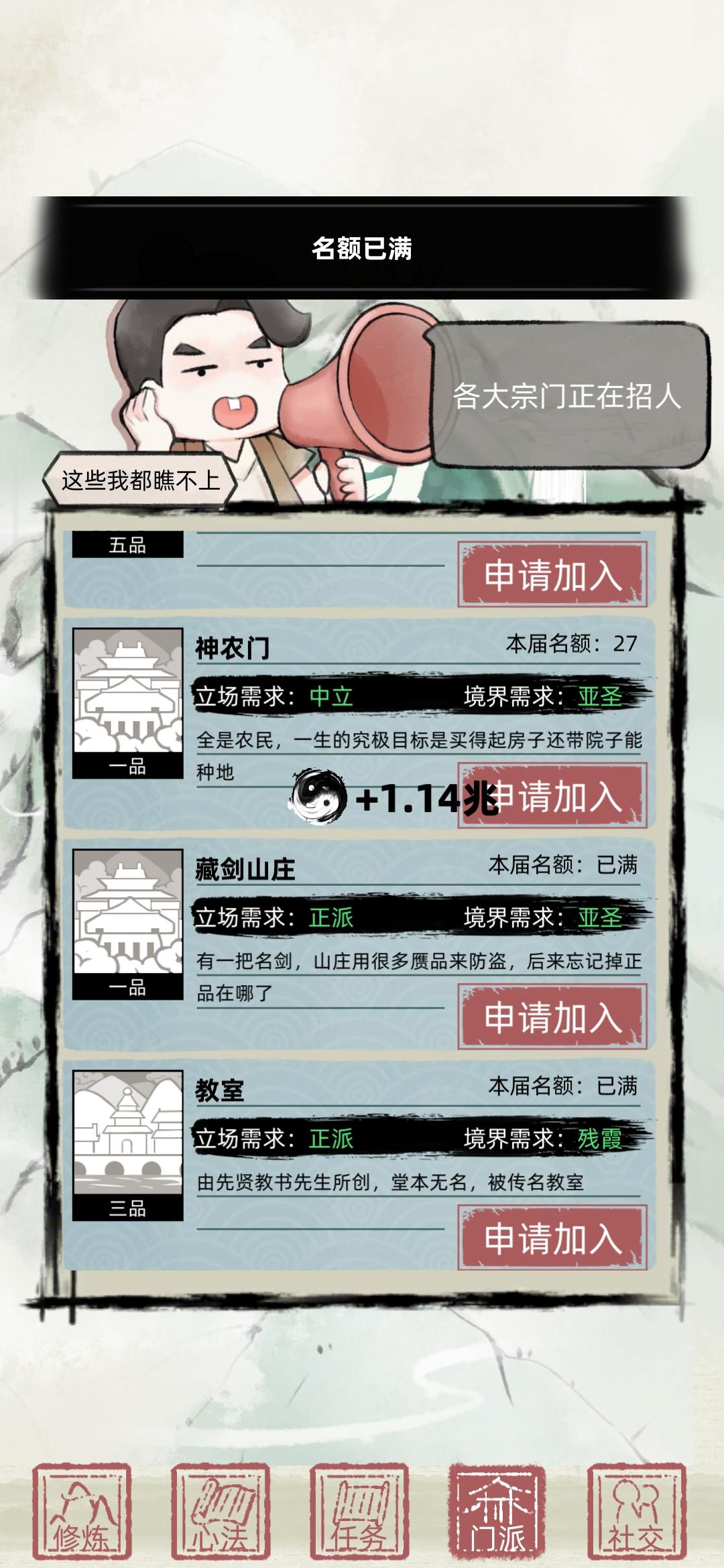 看广告出来的宗门根本没法加啊……一直点没反应,最后人满了终于告诉你满了
