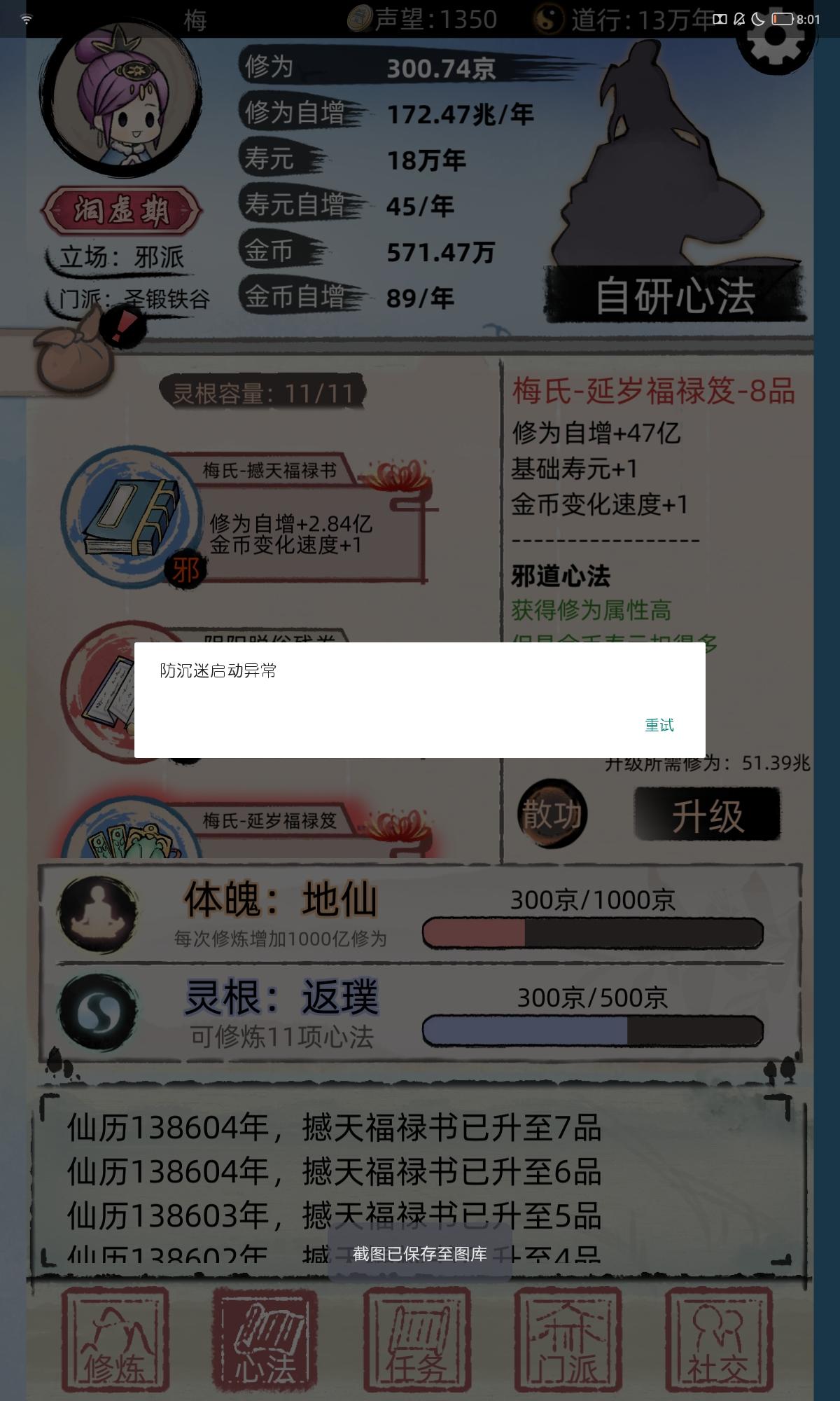 貌似存档有一些问题,下午下线的时候特地点了手动保存,晚上上线的时候从化神掉到了元婴,而且离线时长表明整个下午都是没有上线的