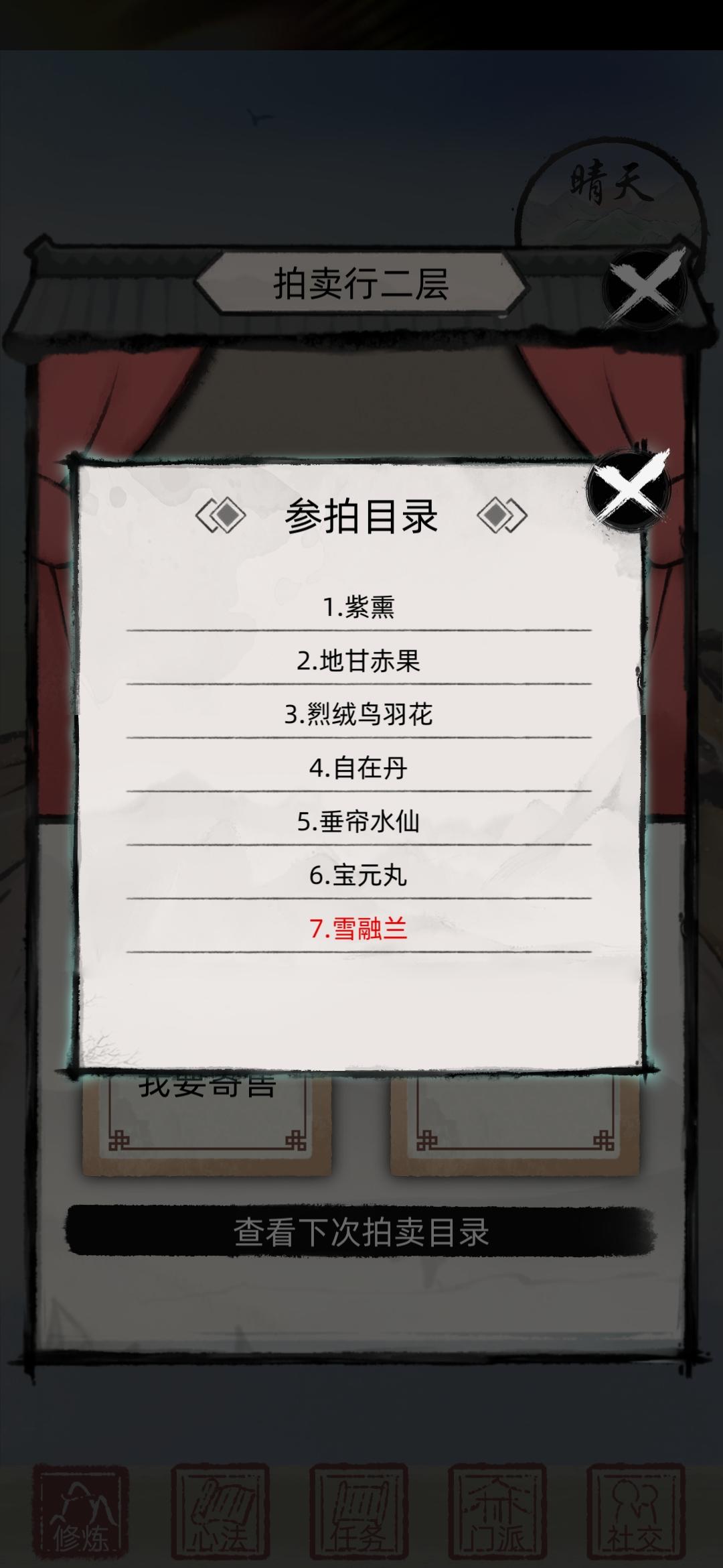 非常好玩的游戏了,有几点觉得需要改善的地方1.1拍卖我自己的红草药基本拍不出npc卖的价格,超过10w基本卖不出去,同样的颜色品种,npc的分分钟过百万。1.2竞价某些物品,在举牌的时候过于频繁,敲锤一次就举牌,然后敲锤举牌,无限循环 看了冒火2.门派希望可以加入门派的时候提示神秘洞府内容,不知道有什么方法可以得知,目前我是不知道了,关于这点也希望可以在拍卖的时候点击查看物品/草药的属性3.待发掘真是个不错的游戏。