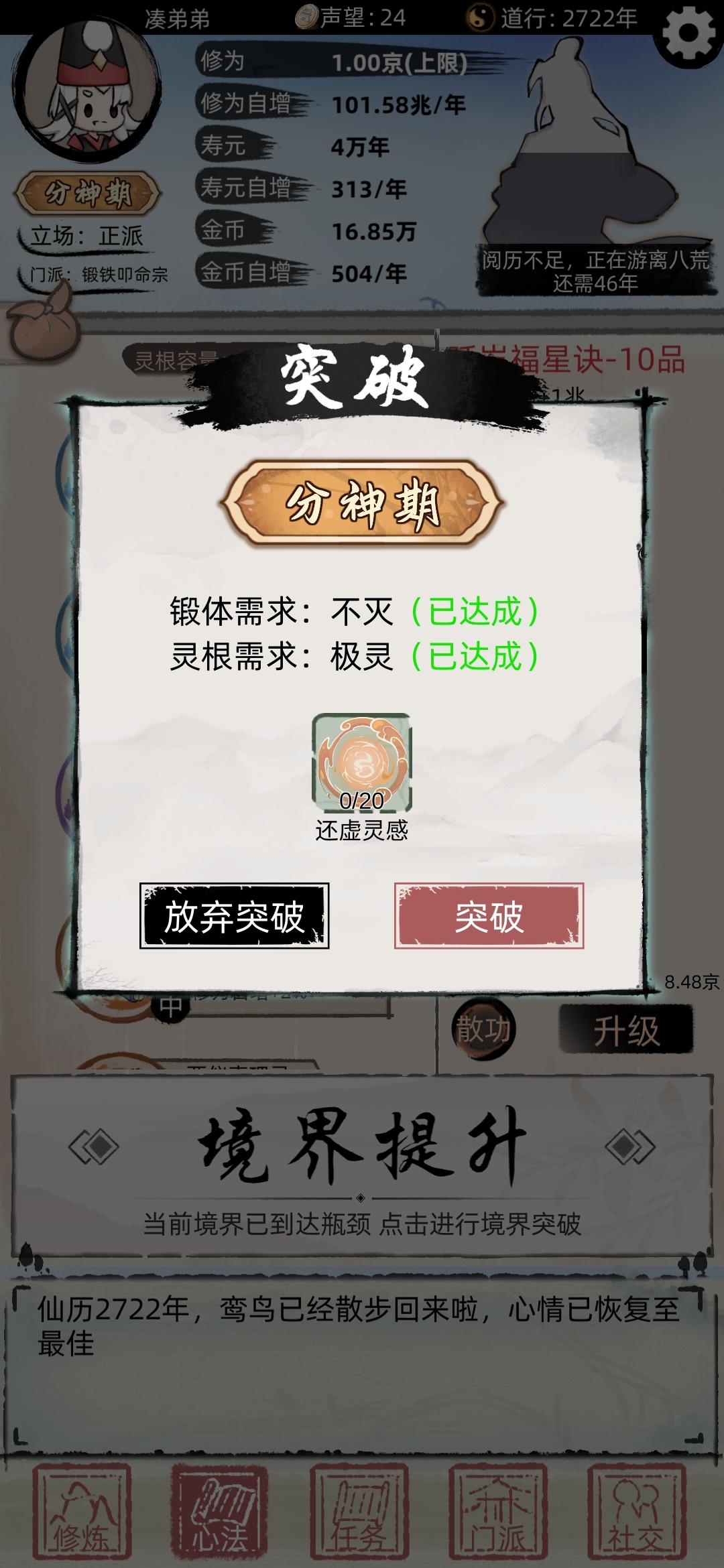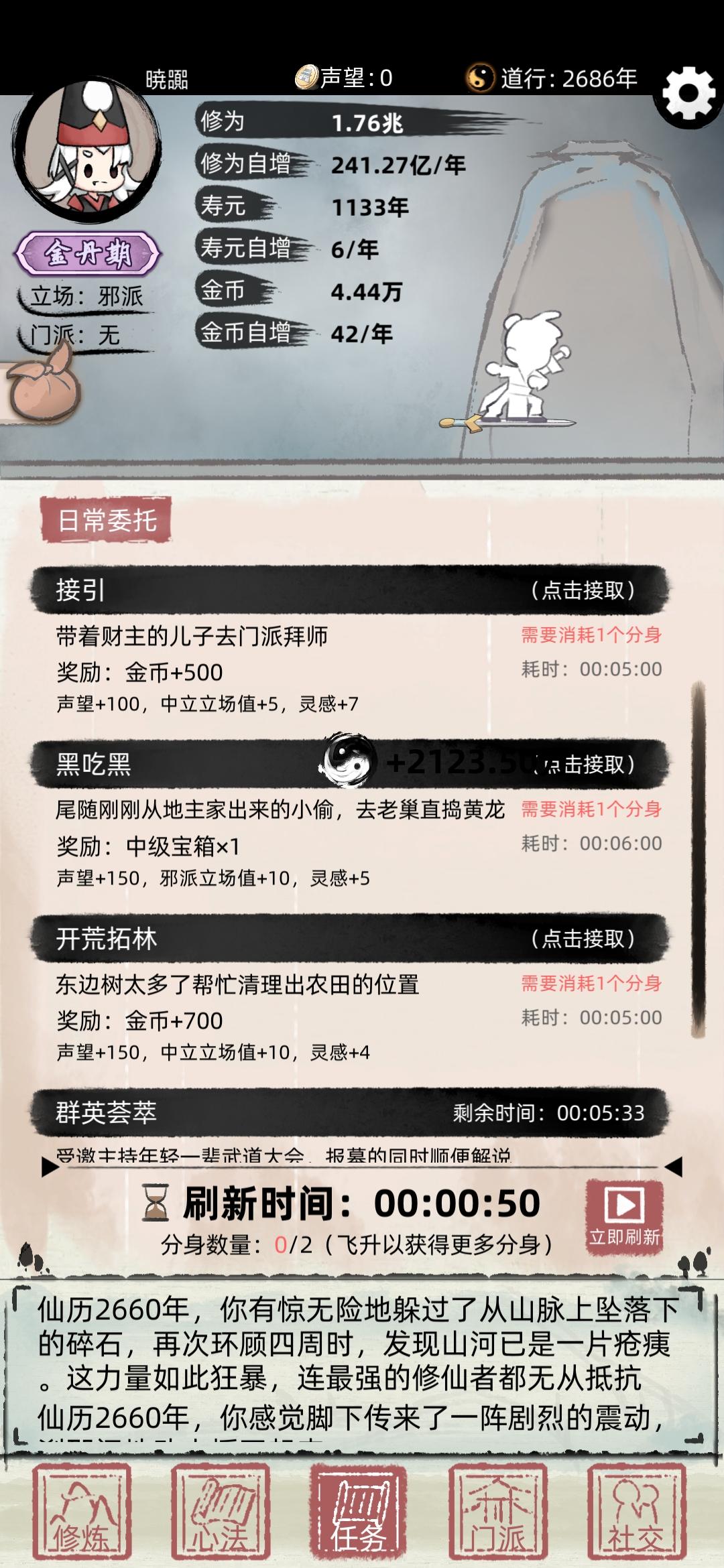 不知道咋让开发者看到这个发言但是还是试着让他们看见,这回的bug应该与宗门有一定关系,我玩了三个档,只有一个档是没进过任何宗门分身一个没消失时间也不会停止,我猜测分身消失是因为换宗门的时候分身没办法停止当前的任务导致它一直卡在那里。估计加一个判定就好了。 反正以上是个人猜测,对的话就快改,我还等着进宗门找道侣呢😋