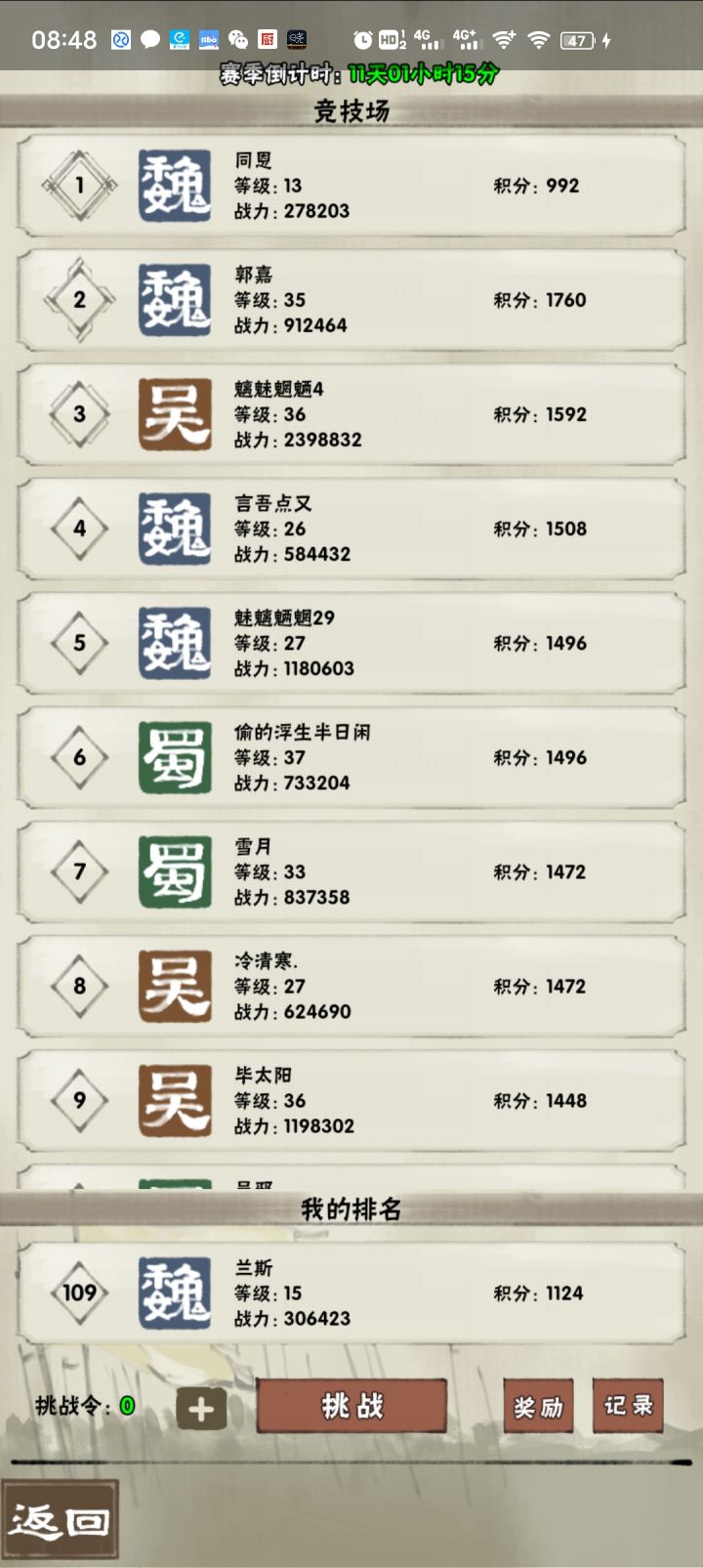 竞技场的积分字段定义错误?那个九百多的排第一了……