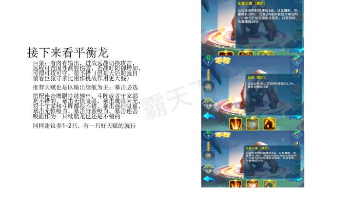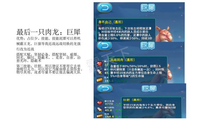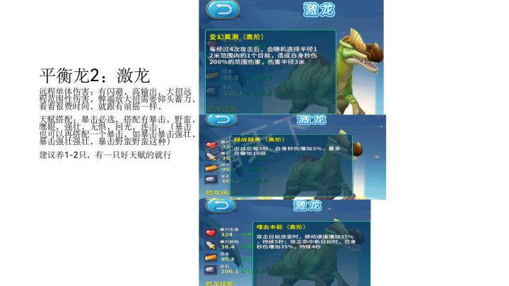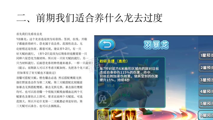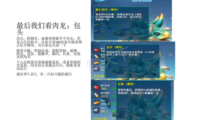 新手前期玩什么龙? ——渡渡鸟(群)前期渡渡鸟群是真的好用,渡渡鸟群一共有五只渡渡鸟,而且还是速度型的,五个加起来功击也有了。养的话建议养三只,连和功击爽歪歪一般建筑10秒内解决,核心的话20多秒吧。而且它进化生星也很好,渡渡鸟10分刷一只差不多,刷5只一般会刷一只渡渡鸟群。渡渡鸟群加上碳龟打怪兽也贼强(先放碳龟)喜欢就点赞支持一下吧!