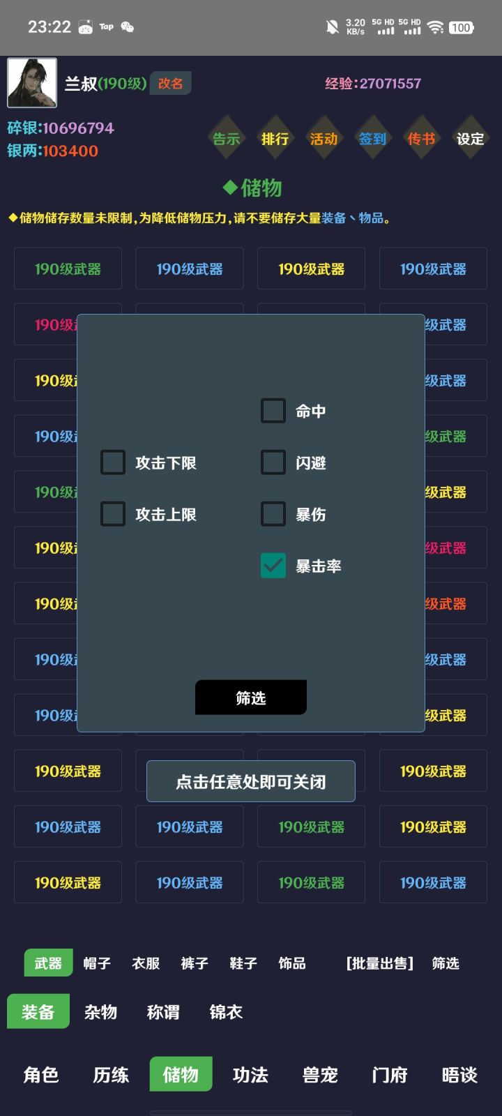 玩了两个来月,简单和新手讲下这游戏怎么玩。这游戏本质上是个数值对撞游戏,游戏内容就是提升自己的面板属性,有点像种田收菜。这篇攻略写于2024年6月3日,版本4.18,长时间可能过期。开局邮件先领一波,取个名字,然后去群里和社区找兑换码,去右上角设定换一下,先用银两在门府里坊市买两本五星火,一本上限攻击一本下限攻击,去下面储物栏里学习,去功法栏里把五星火升满,升满再点一下激活,加快推图。先刷一百个