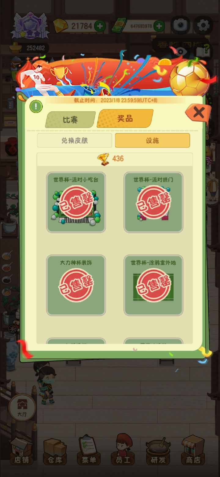 服务评分和美食评分都不够,菜还差十五个,应该全是活动菜品要用积分换,但是员工都聘完了升满级了,还差这么多都是活动皮肤吗?现在只缺积分了,每天上线能搞的积分又有限。请问一下大家我有没有漏掉什么别的呀
