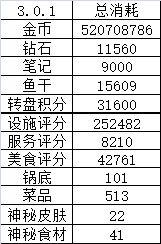 图1:3.0.1版本更新内容消耗图2:开服到3.0.1版本总消耗图3:3.0.1版本最高评分提醒:3.0.2和3.0.1内容没有区别,只是修复bug;神秘皮肤实际数量是29(22+7),有7个皮肤现在可以花费800钻石购买,所以没有算进去(你如果没有这些皮肤,直接花费800幸运积分兑换神秘皮肤,有可能兑换到这几个皮肤),这几个皮肤包括:阿宁的新年皮肤、3楼厨师的6个龙虾季皮肤