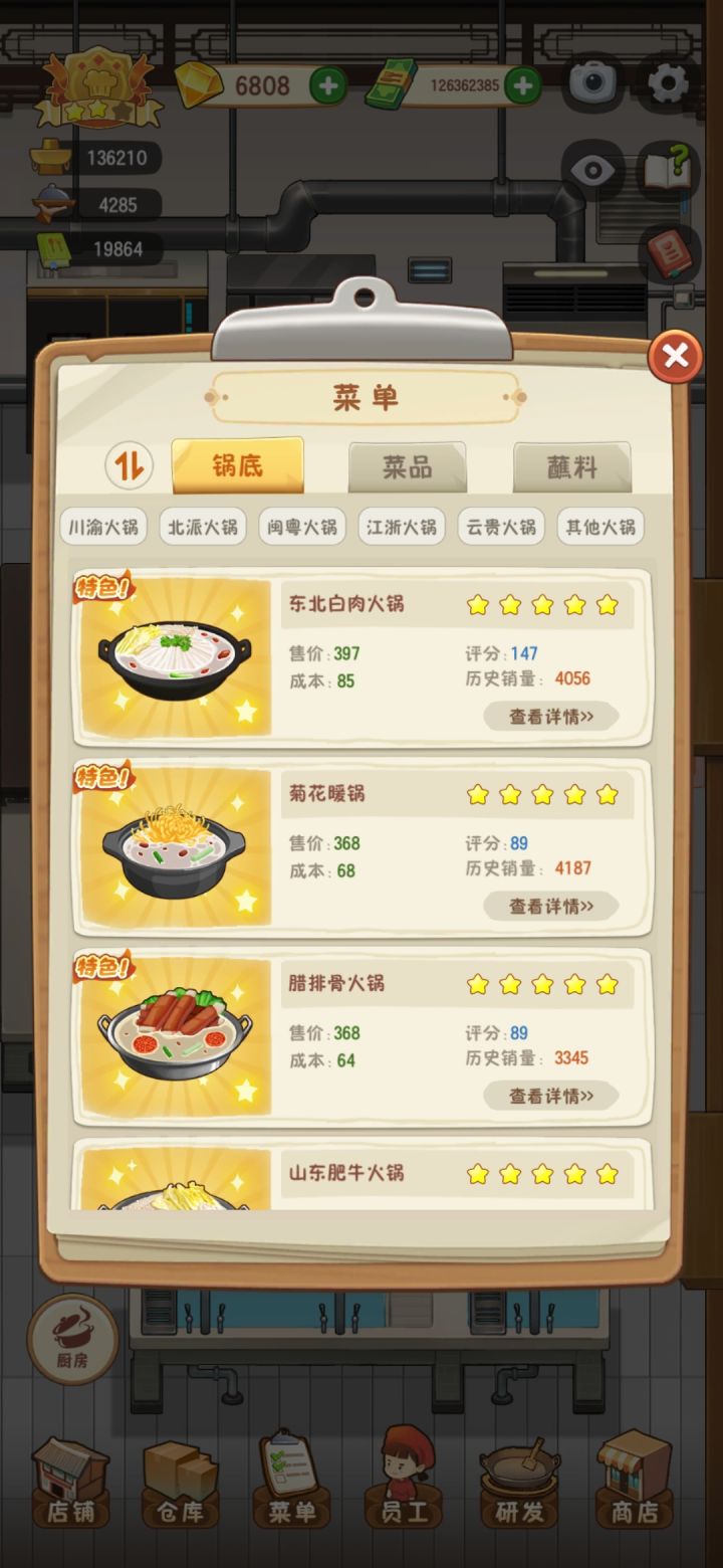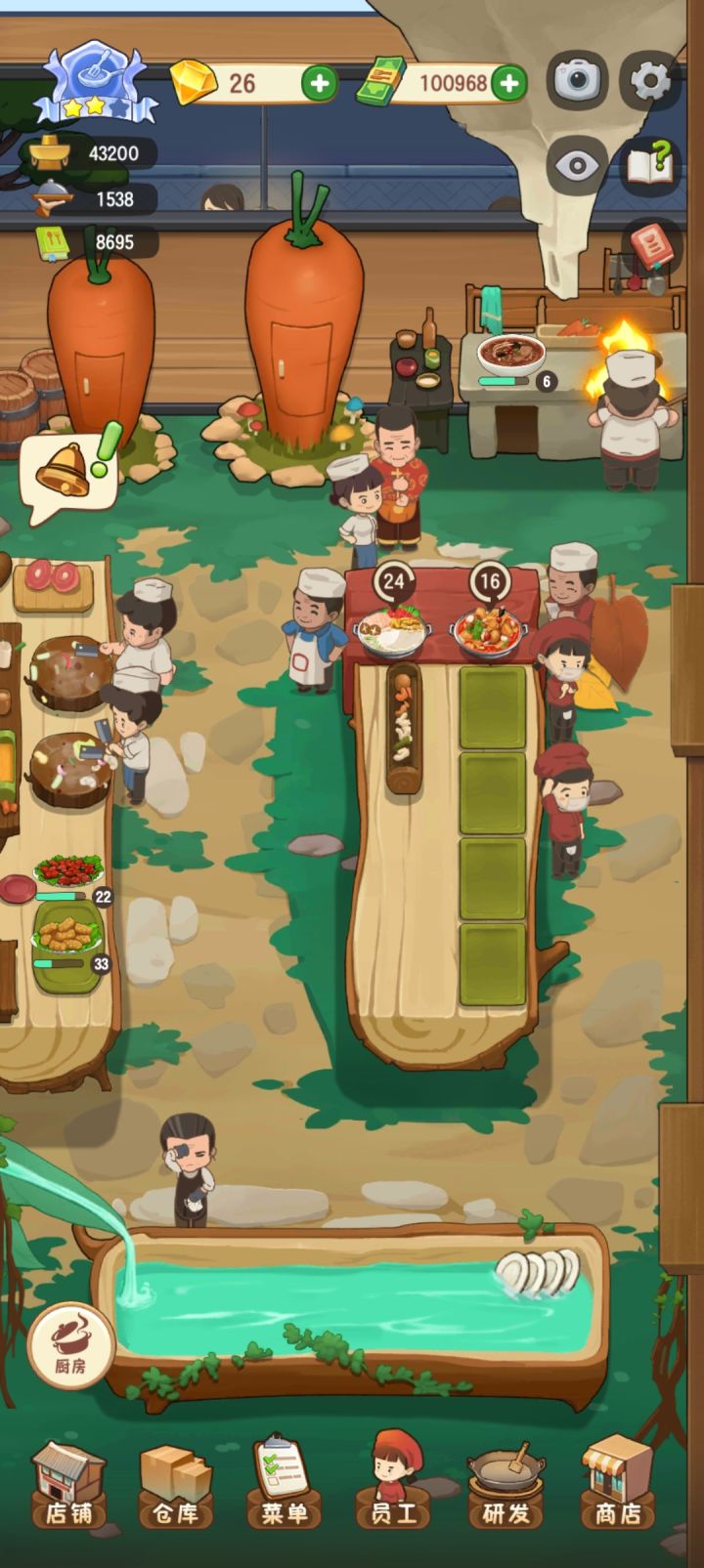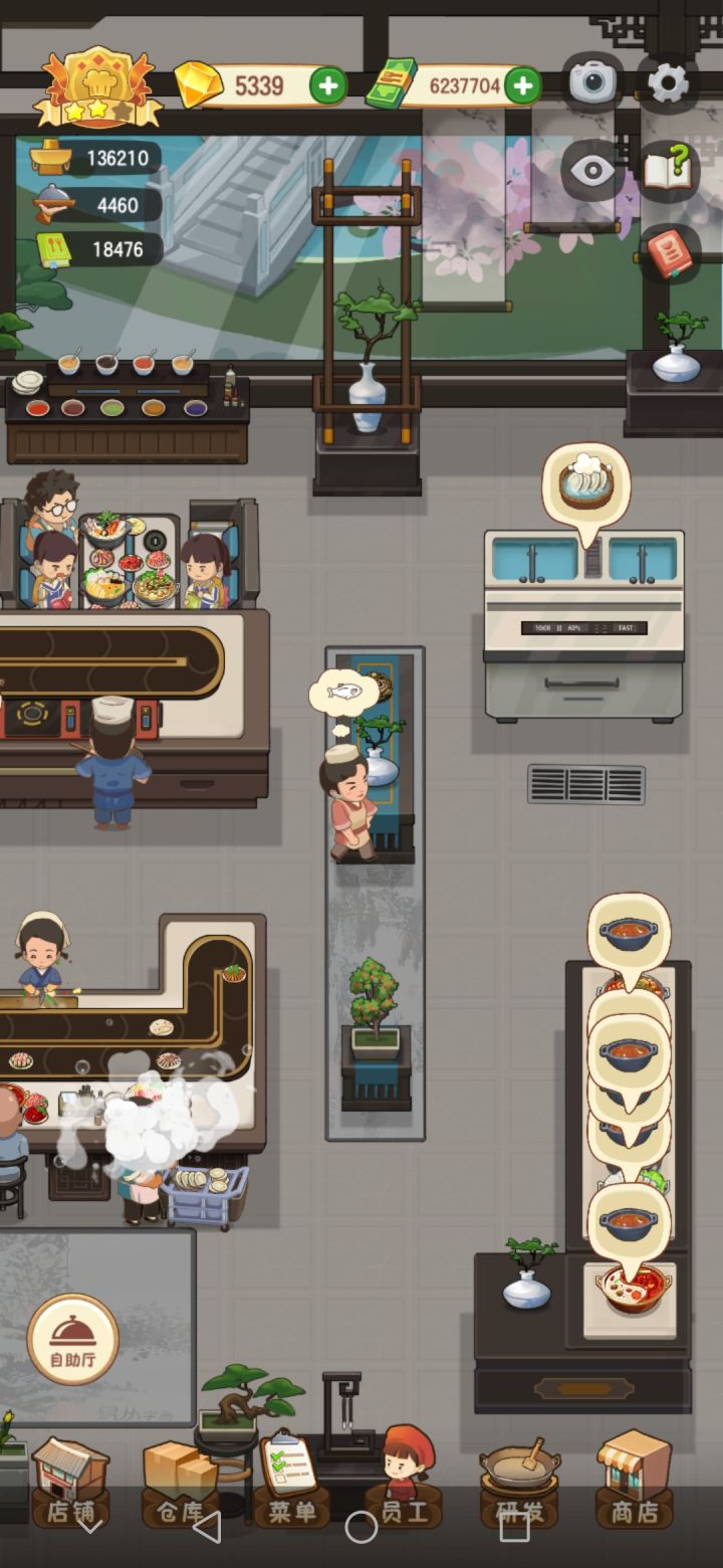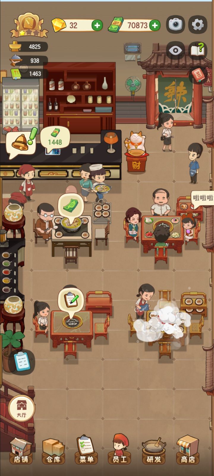 每次看到这一堆端不完的锅底和洗不完的碗就想卸载游戏,三楼真的是为了更新而更新,很多细节都没有考虑到,人手问题,装修升满了加个2%的加成,就坑了五千万😡😡