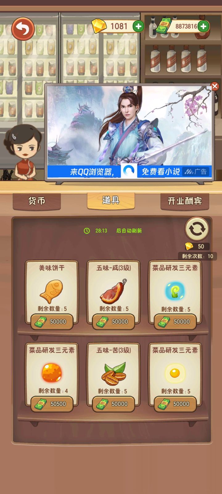 一,你疯了还是我疯了?你自己看看,这玩意卖五万?这是bug吧,害得我买了,真的无语。二,这个出菜了没有按键已经好久了好吧,几次更新都没有改啊!有的时候等了十几秒二十多秒才有啊,还有三四个菜都在案板上,没有图标的,赶紧改吧
