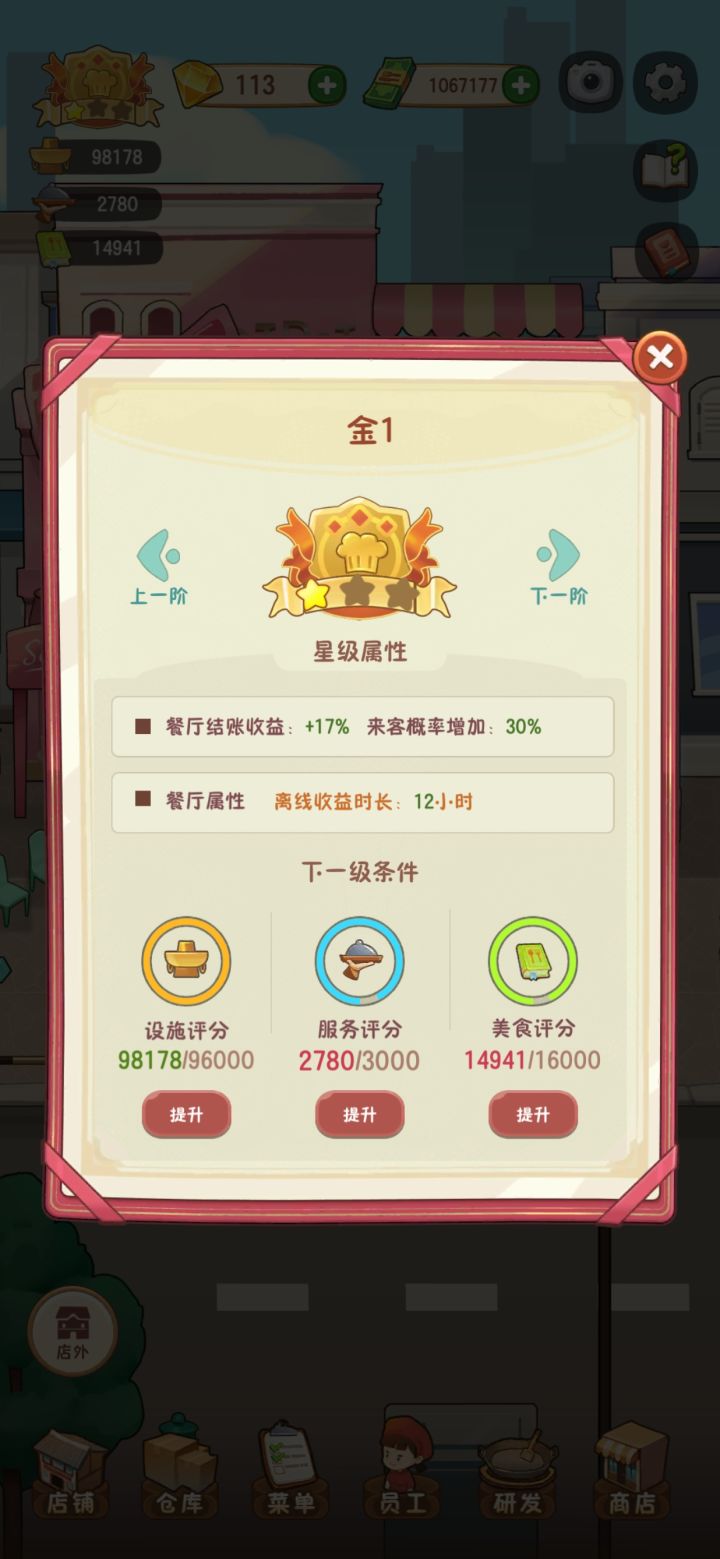 希望增加菜品的历史销量排序,评分排序;可以开分店,可以创造新菜品,打磨已经有的菜品(精炼),增加外卖,自助餐,西餐厅,增加桌子门凳等饰品的精炼,强化,打造,增加厨神系统,各大分店店长排行,增加赚钱排行榜,身价排行榜,菜品排行榜,还有最重要的我不知道每分钟或者每天赚多少,另外招募的员工要适当给工资啊,厨神争霸赛,传说中的神具奖励等等