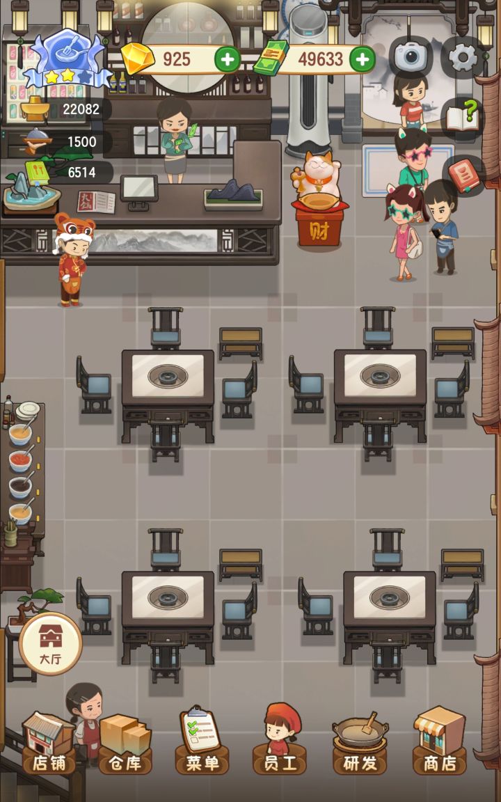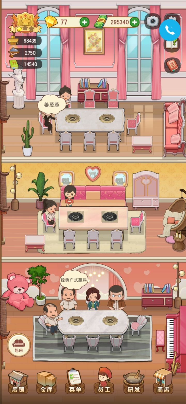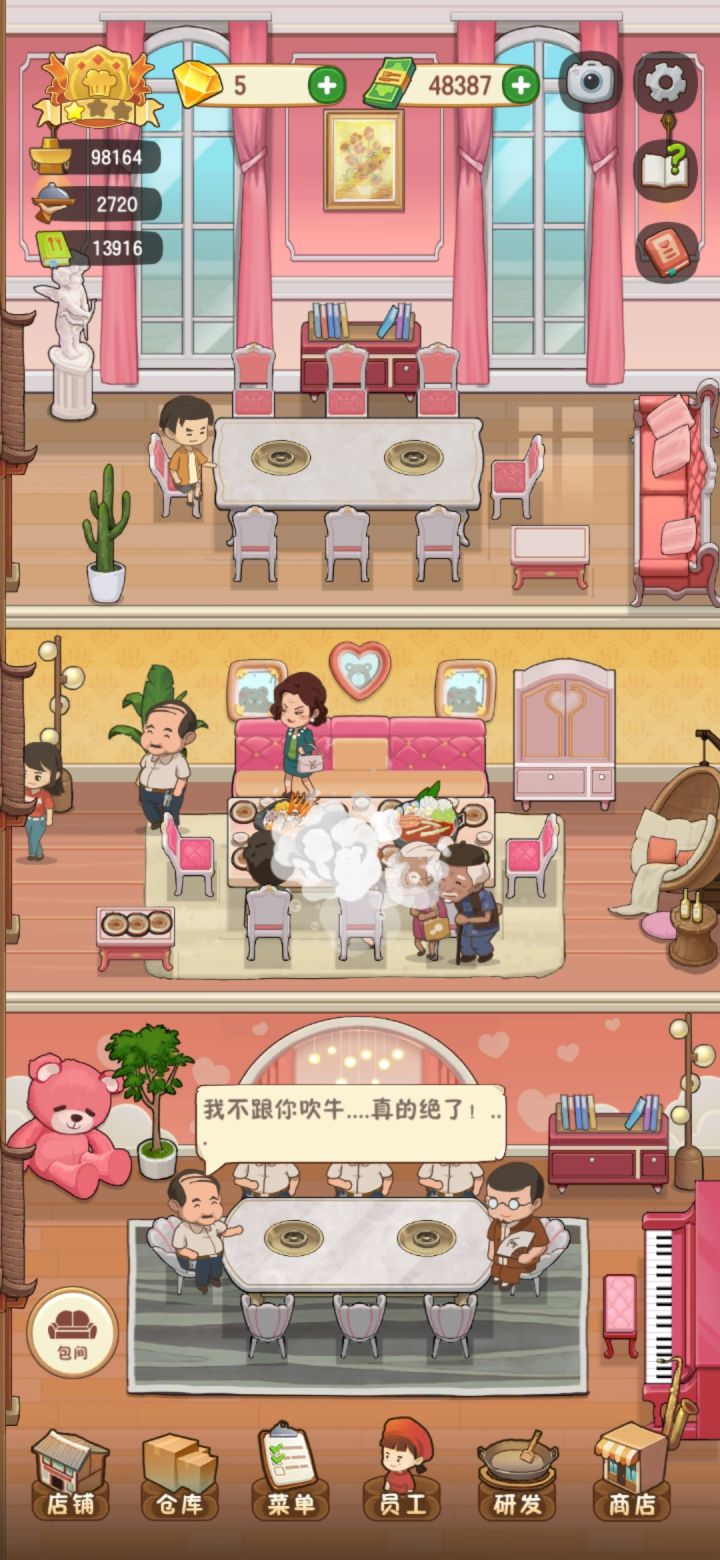 受不了了,赶紧修复bug吧!!!两个人坐大桌 包间,四个人坐小桌???客人的腿都在桌子上,厨师还出现在收银台,道具里的东西太贵了。。。