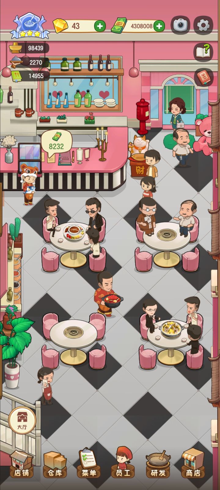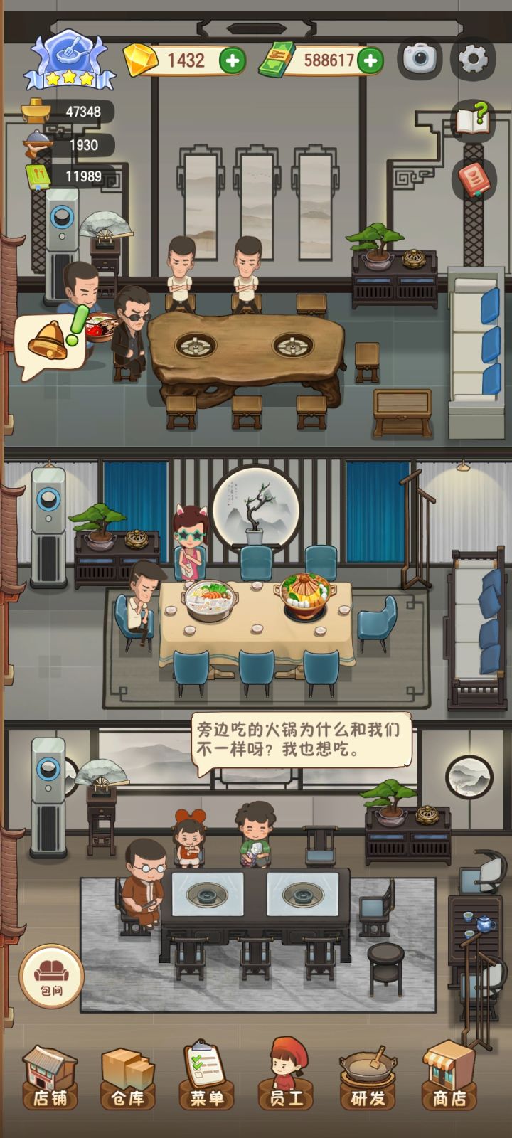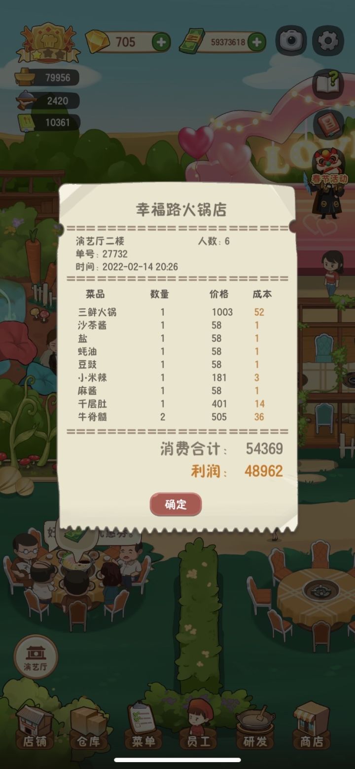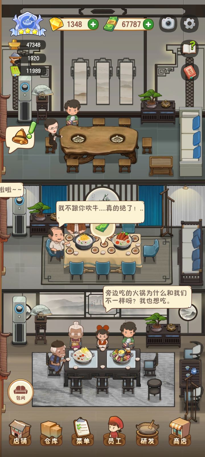 更新完,三四个人都不去小桌吃,非得去二楼和包厢蹭,然后消费个七八百,这样真的好吗😑😑😑麻烦下次更新时候把这个bug弄掉吧,不然越来越不好玩了