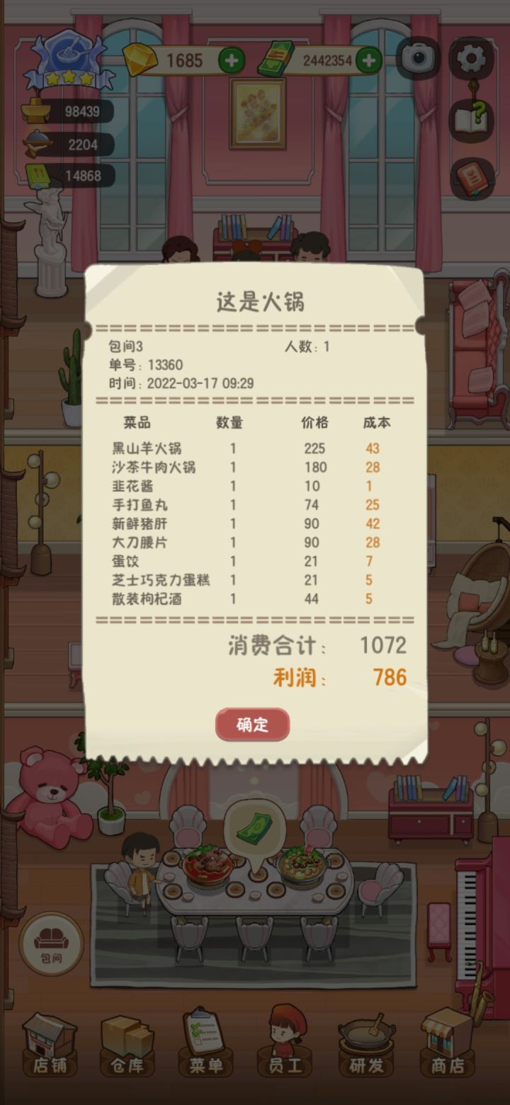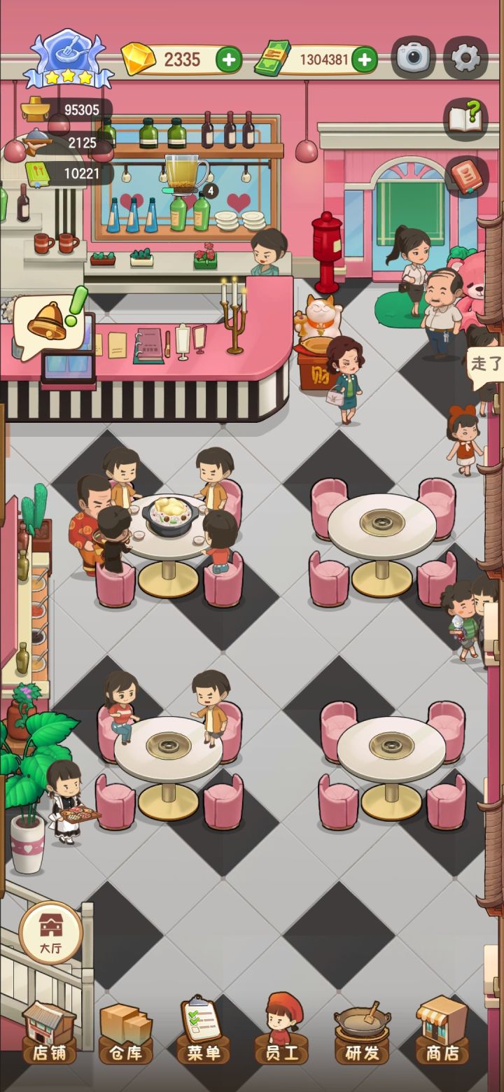 连续两次的更新之后,让人很是无语。员工手册依然难得,又加了个鱼干,更是难得。道具里的东西,是越来越贵,家具非要必买吗?服务评分就是累死,也不好升级!!!火锅和菜品的重复率很高,烦!一楼厨房 也不再增加个厨师。应该分的更细点儿,切菜的,炒料的和做小吃的,还有一个调酒师,这样才好。火锅店应该有个火锅店的样子,厨房的声音,大堂的声音,和服务员之间的声音,都应该凸现出来,不是只有背景音乐。为什么不弄个电梯呢?应该把道具上面的广告给去掉,好丑,碍事!演员的位置之前有四个,现在只有一个不说,还要再花钱买,郁闷!!!目前很是期待三楼的自助厅。