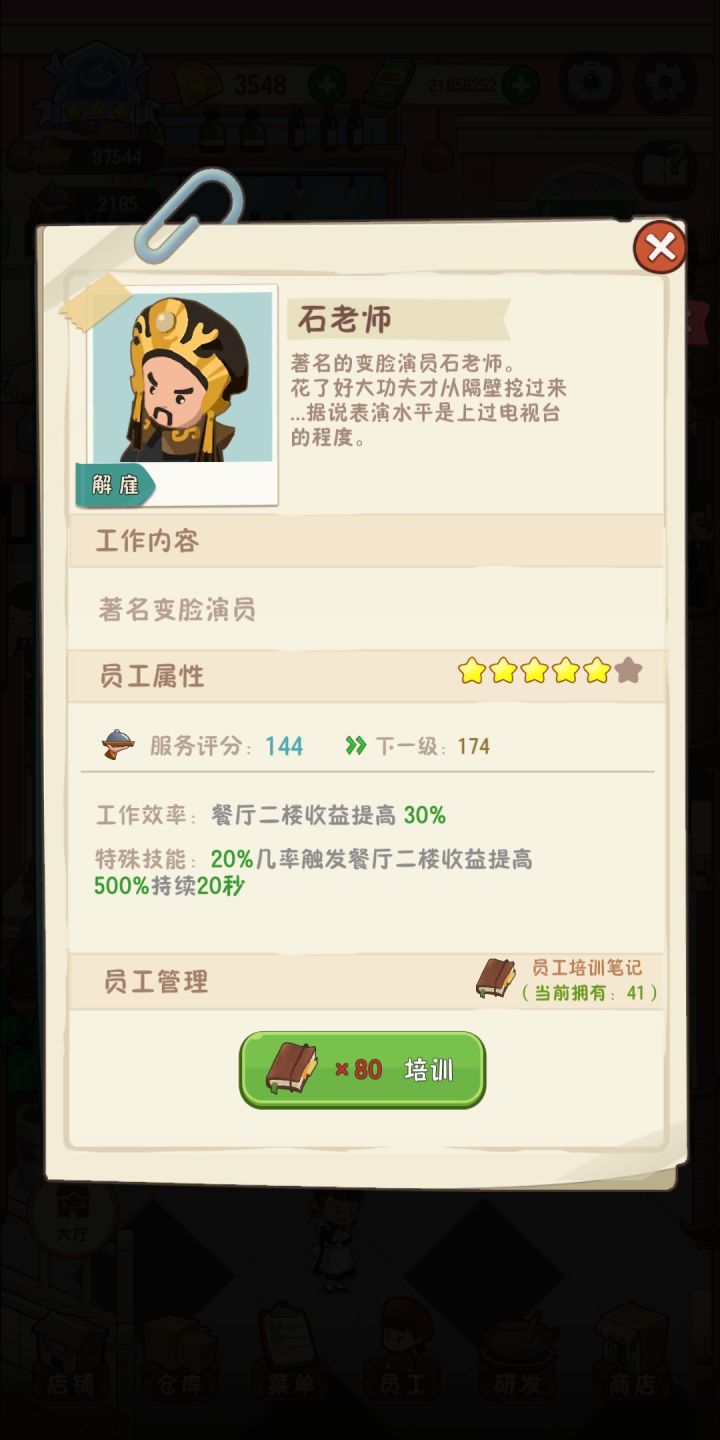 员工升星没问题,希望多一些获得员工手册的渠道吧~~不然每天免费的➕五次广告,也才给一个员工升一次,每次卡服务分卡两个月(?)