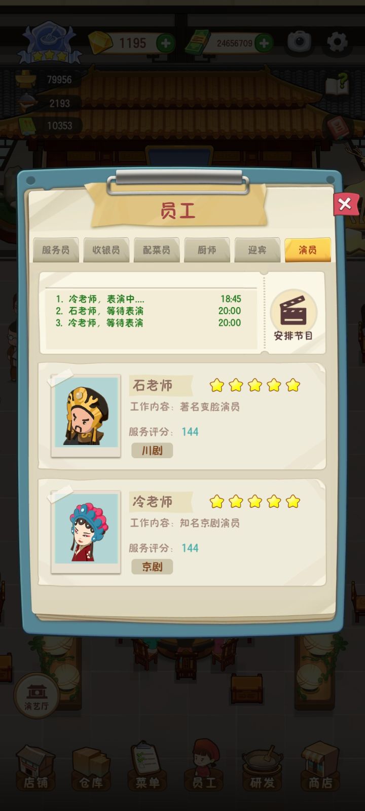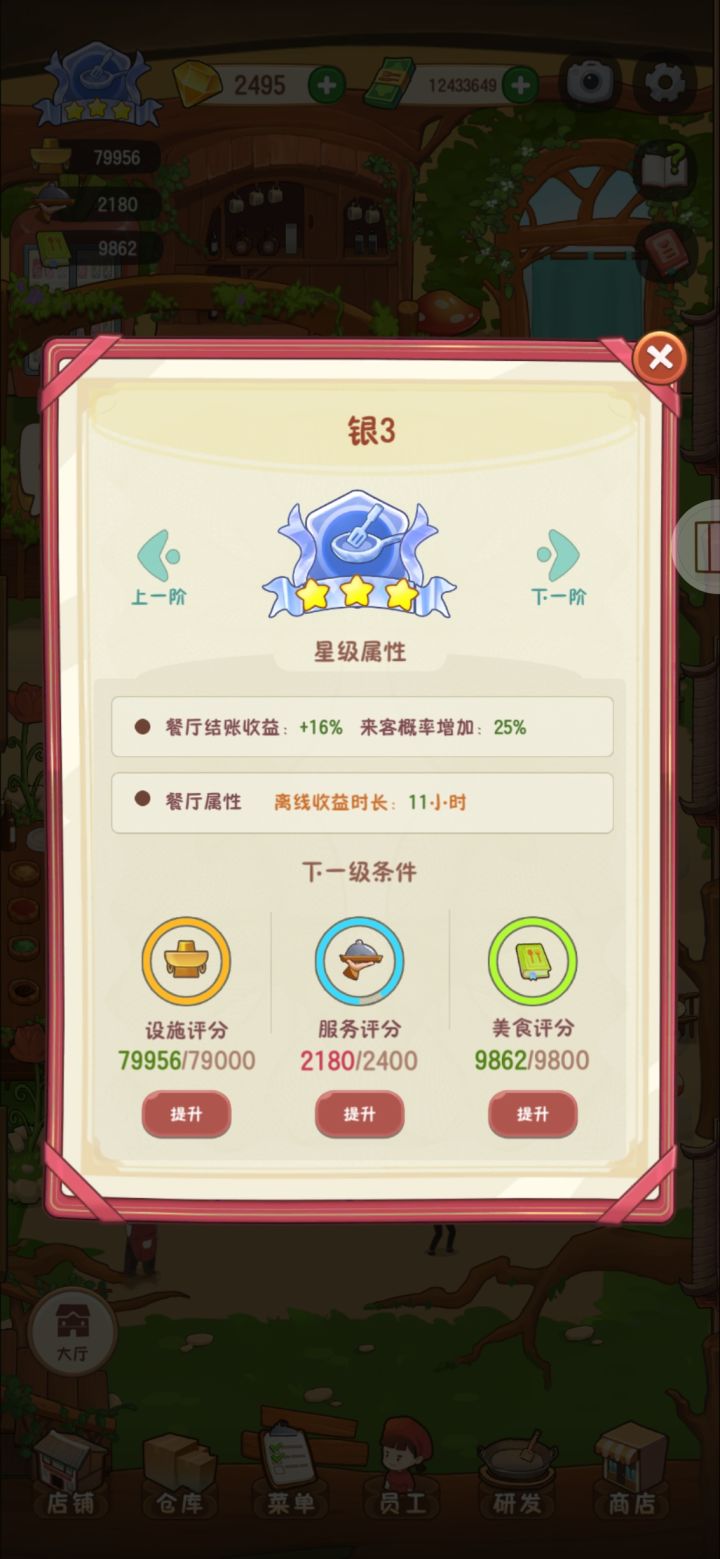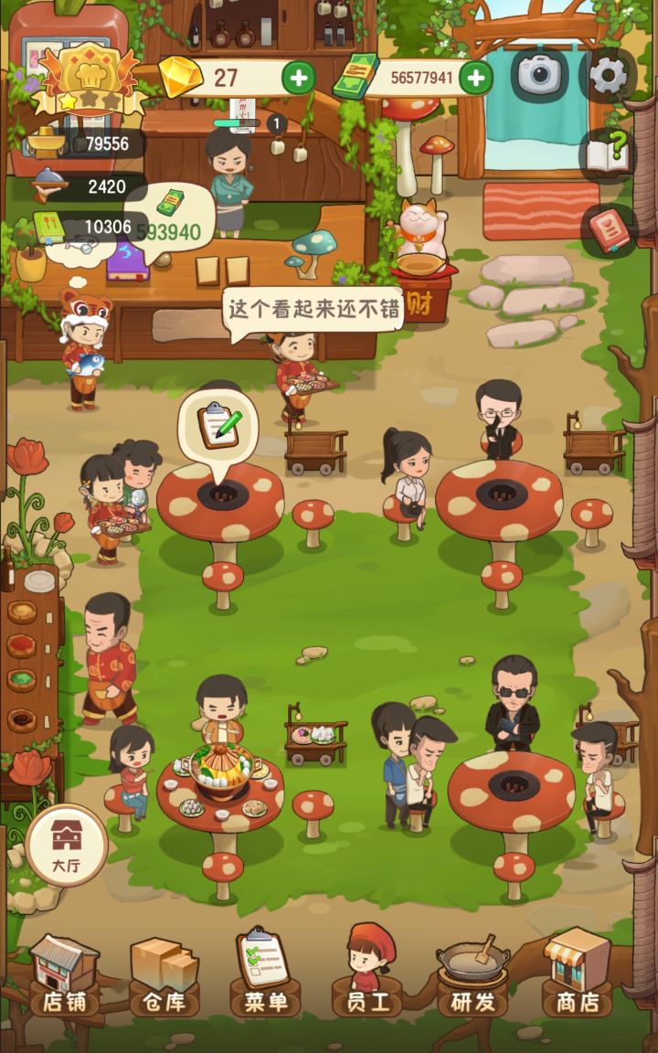 好了好久的游戏,整体感觉不错,但还是有好多希望能够尽快完善,以下都是需要完善的清单,望尽快实现😇😇😇1-希望能尽快上账号系统,不然哪天一个不小心就卸载了或者换手机就要从头玩!!2-希望能给厨房配2个配菜的师傅,1个切菜的师傅,1个炒菜的师傅,一个洗碗阿姨,能给一楼再配个收银员,不然忙不过来3-希望仓库和食材探索页面能够设置一件合成或者一次合成多少的按钮,不然点的手指能废掉4-希望把服务评分
