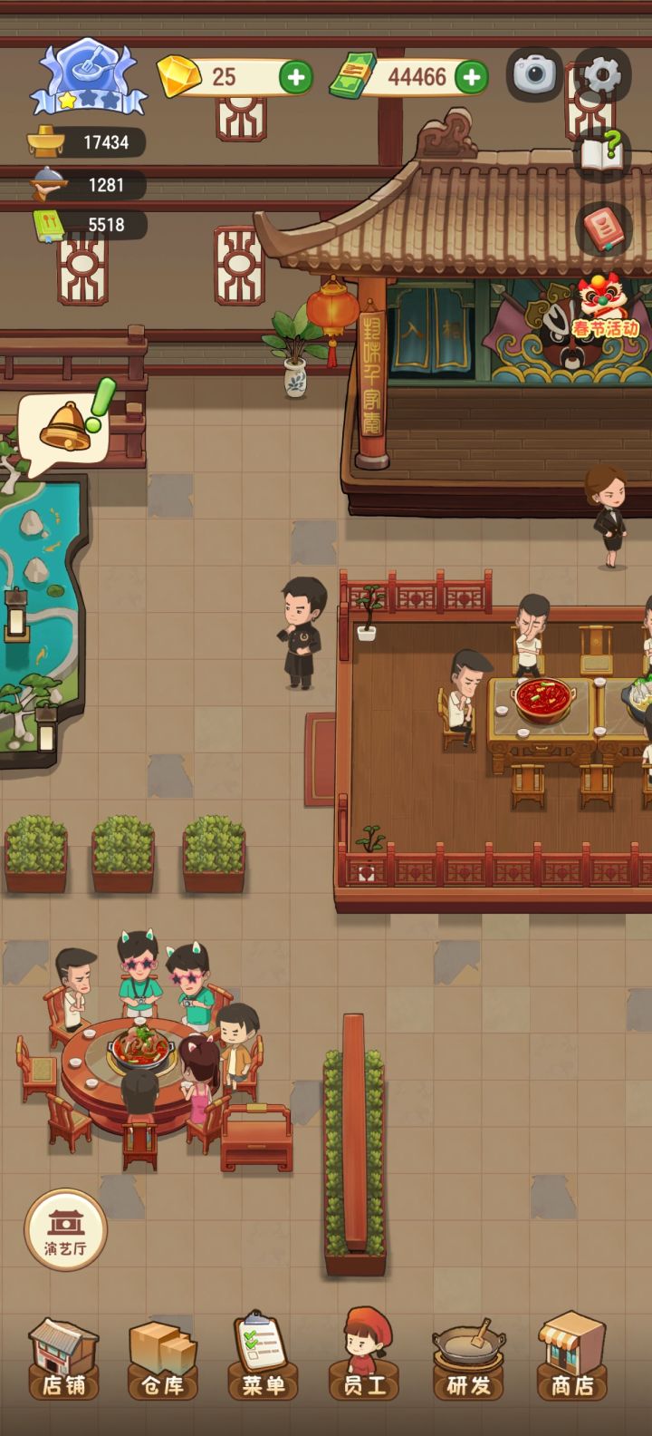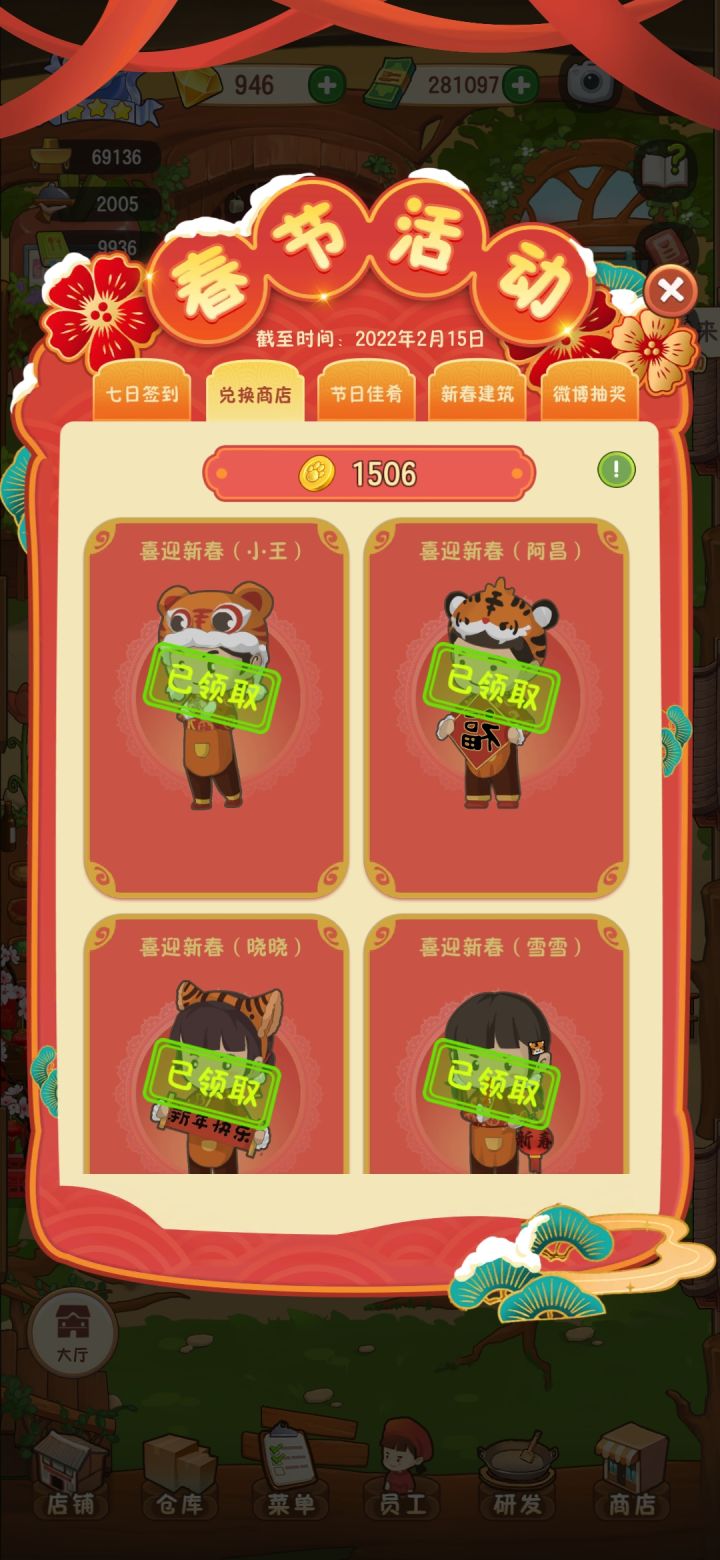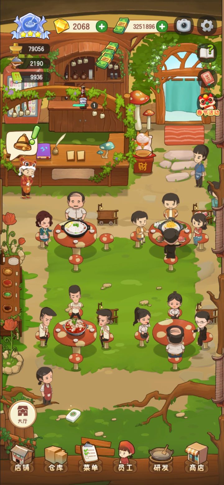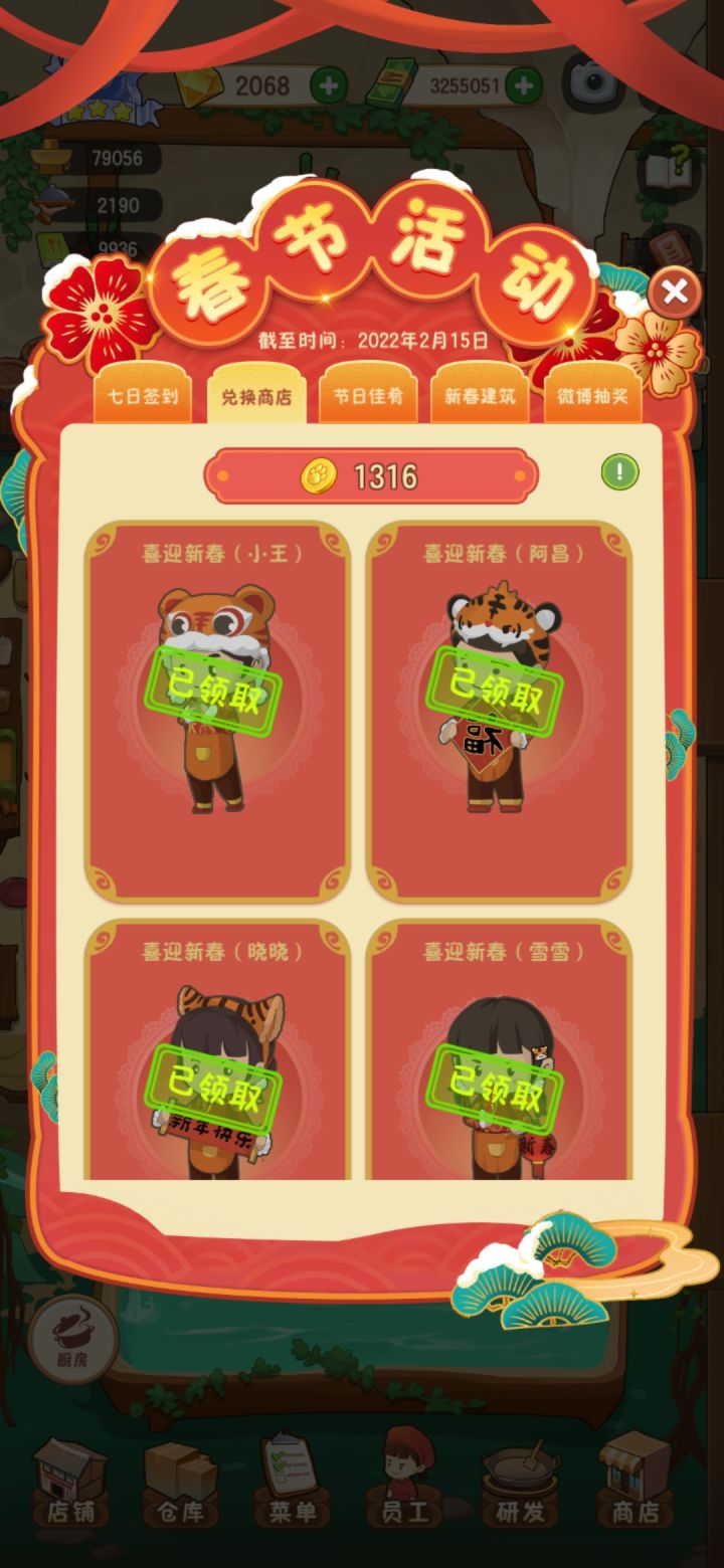 啥时候更新啊 春节活动那点东西早都整完了出来的也就更新到金一,店铺升级还有菜品都满了,没有可升的了,就给员工升级就完了这春节活动整半个多月就那么点