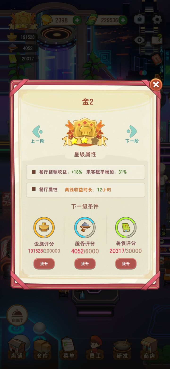 该说不说,我费了半天劲上的金三。外卖功能还说暂未开放。我金二的时候就说金三能开通外卖功能。好家伙,官方是不是给我画大饼呢。我就是因为这个才着急上的金三。然后所有设施全部解锁,自助区全部满级。设施评分还上不去,你逗我呢。现在啥也解锁不了了,然后让我上钻一才能解锁新的设施。你告诉我,我该怎么上钻一?还有美食评分也太慢了,为了挣那点小饼干,我得攒好几天才能出一两百的。也升级不了几个菜。
