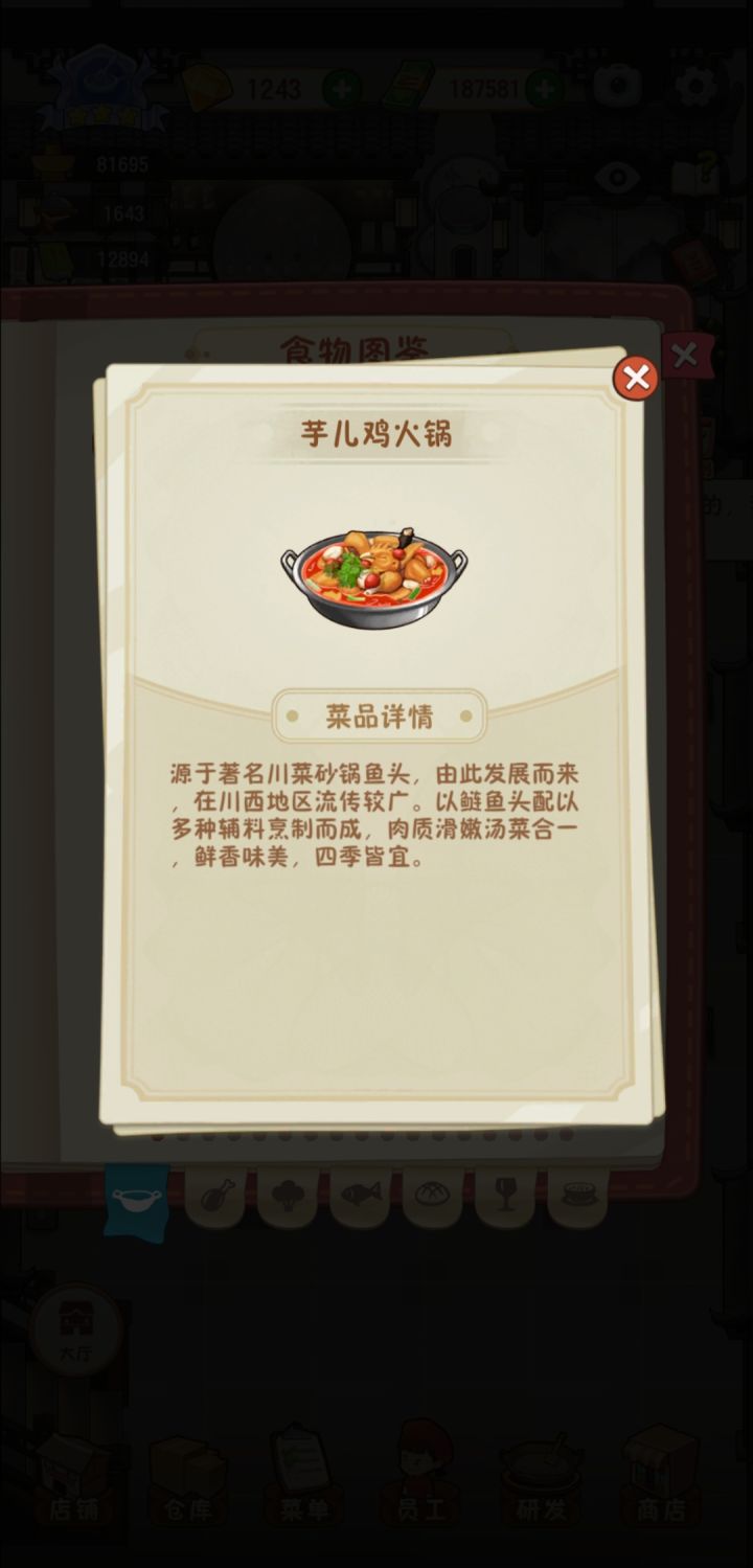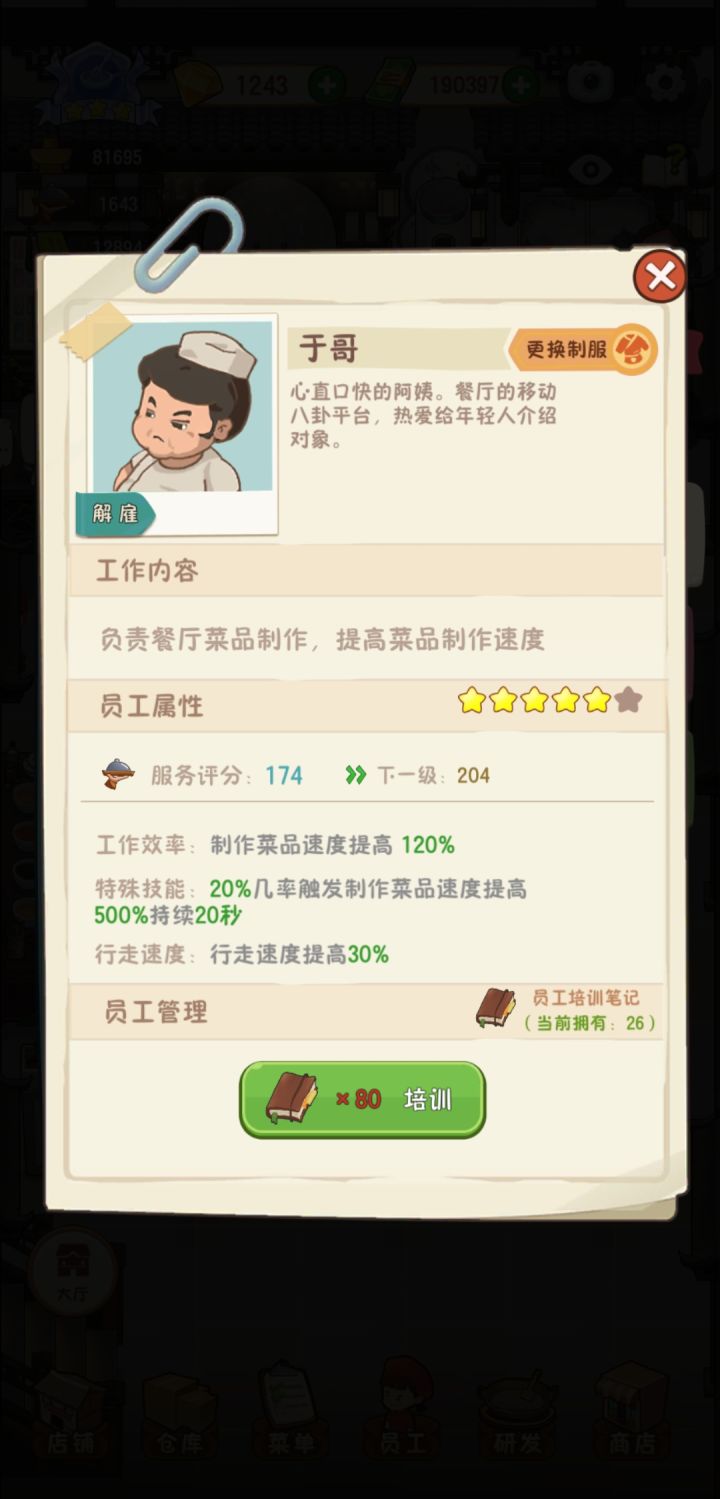 总体来说我是很喜欢这个游戏的,就是玩法比较单一,所以有几点我想建议一下。 1. 某些消费不是很合理,比如一家四口(两个老人两个小孩)消费两三千就很离谱,吃这么多肯定吃不完。 2.由第一条得出可以衍生出一个打包系统。 3.我的想法是能不能由玩家设置过个几个月或者多久以后可以出现一个活动,设定打折,根据打折的多少增加客流量。 4.增加合理拼桌,总是一个人占一桌有一点小浪费,可以让玩家控制客人进行拼桌然