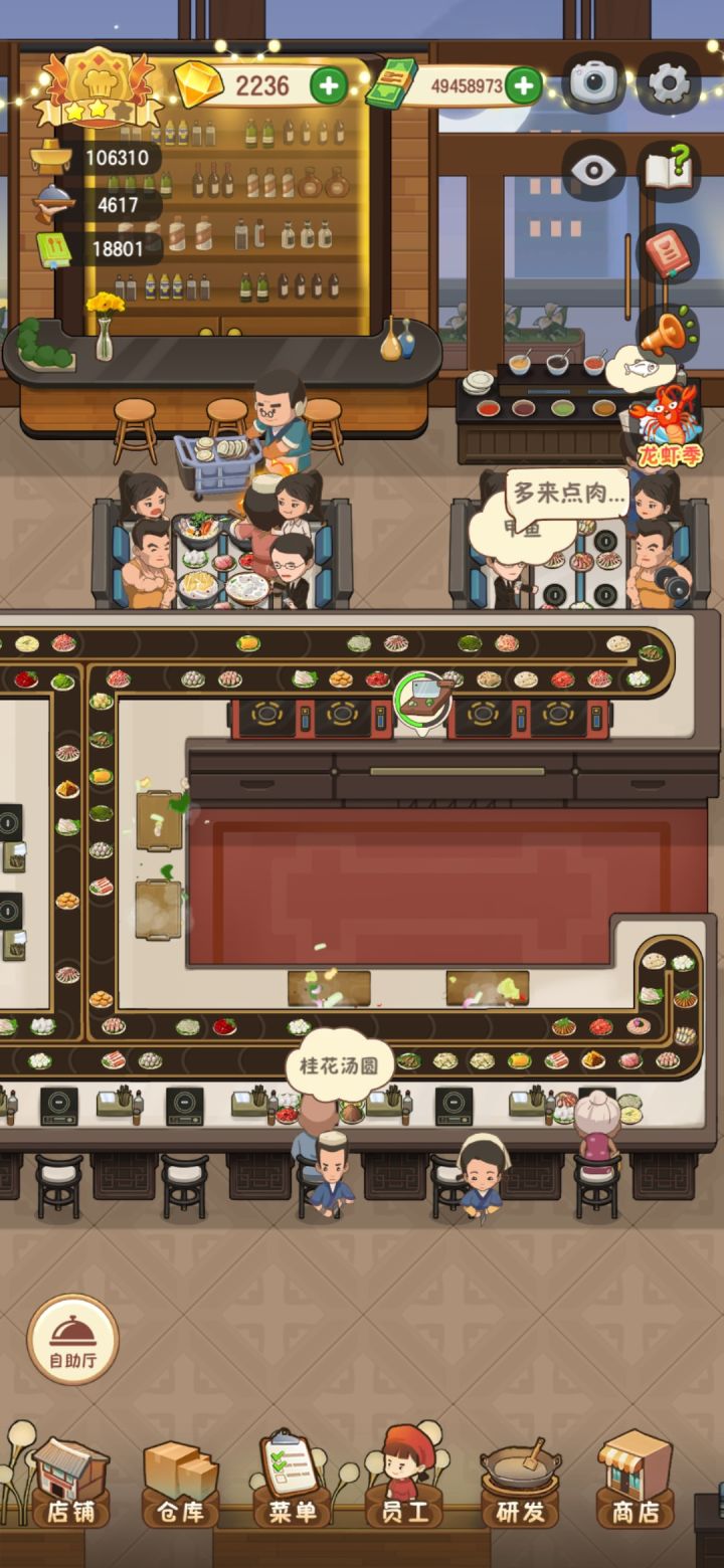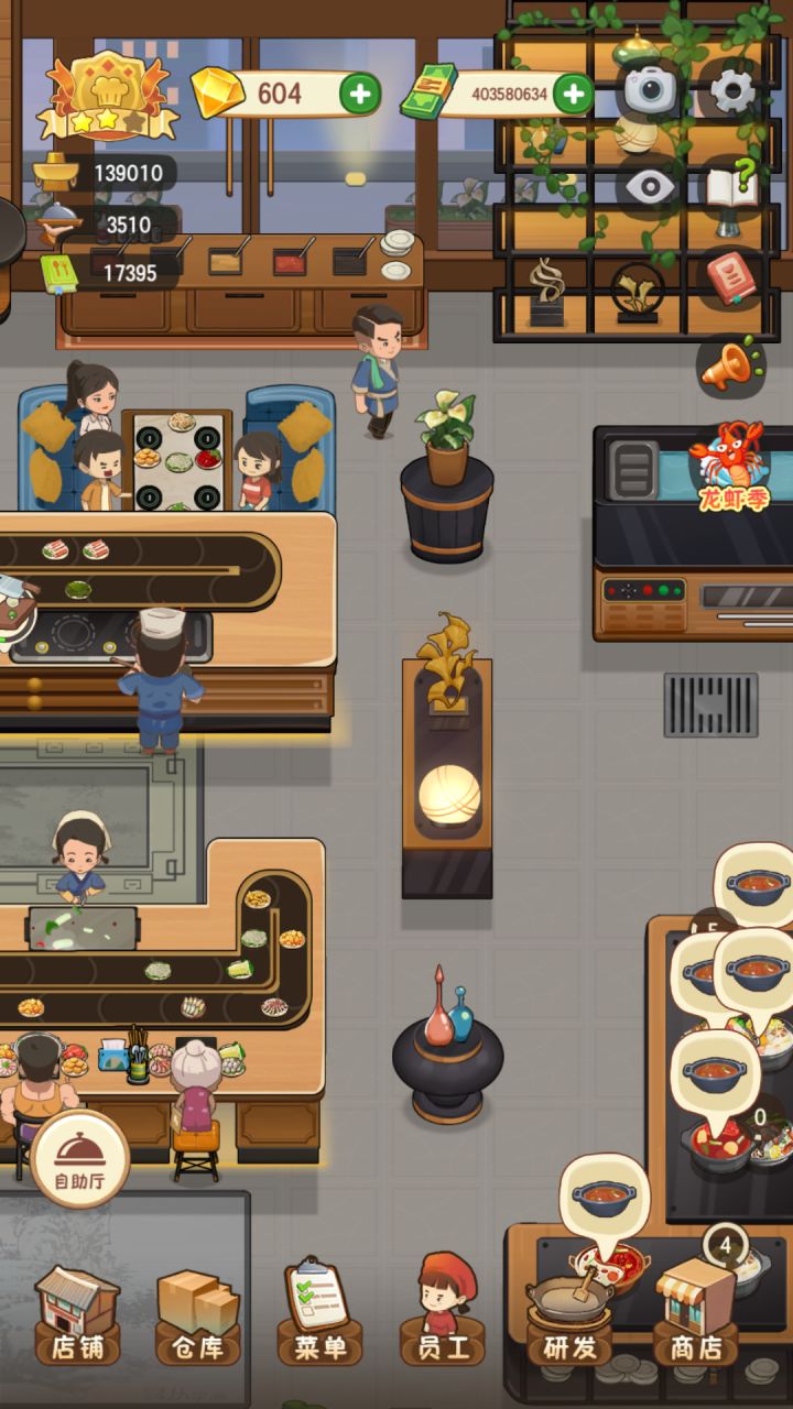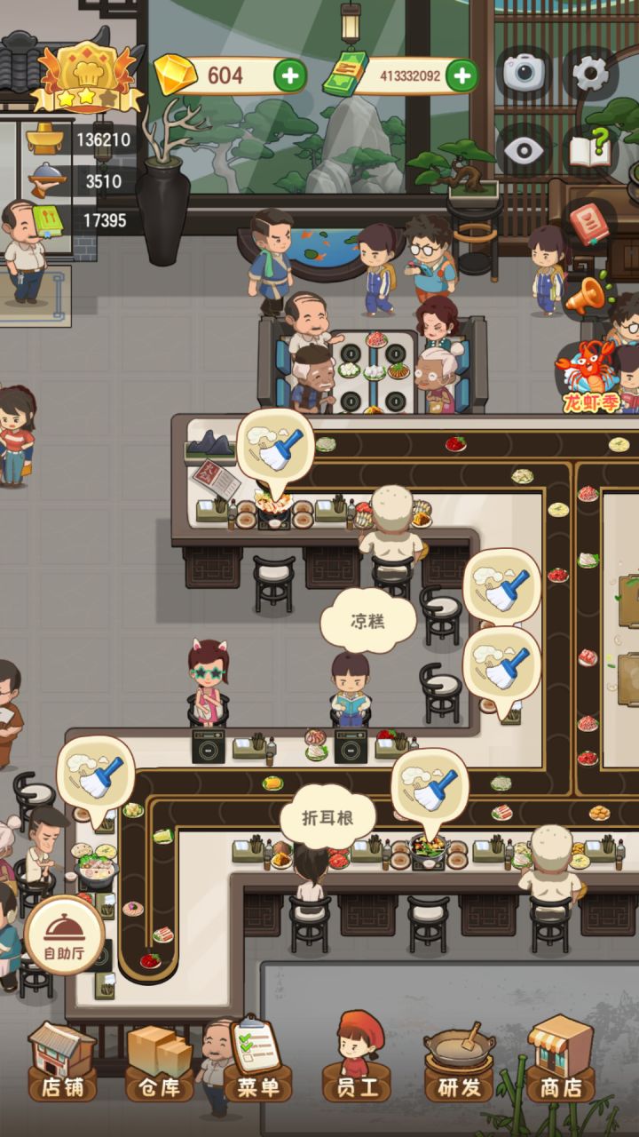 更新完扫地僧还是傻不愣登的,虽然站位调了一下。胖子去收一桌了还是会往那个方向走不收另一桌。另外自助厅端锅底的人手明显不够啊,我都升到最高级了,每次还有一大片锅底没人端