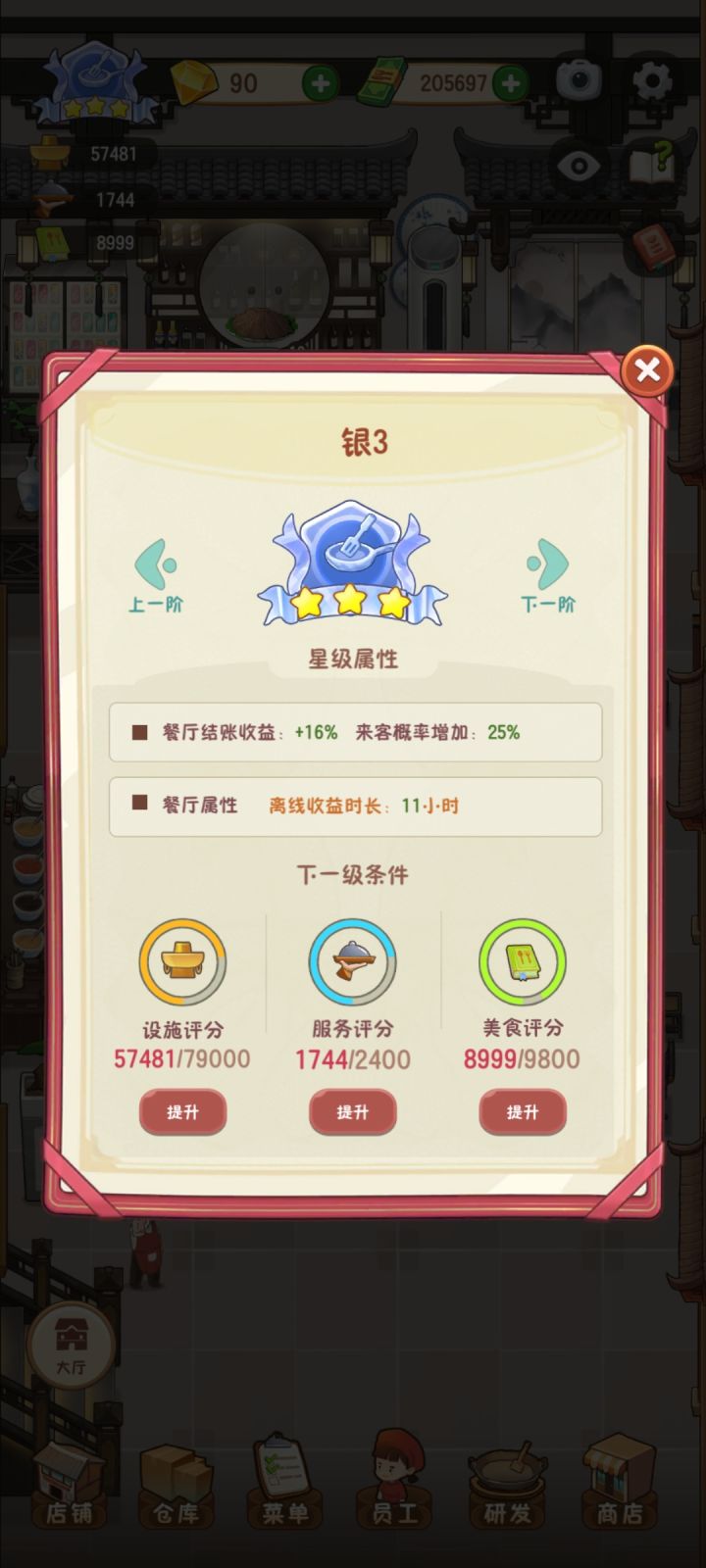 银一之后的金币开销太大了,完全遭不住,金币广告都看上限了还不够,银三之后完完全全就是慢慢等慢慢看,开个后台挂着,纯纯大怨种,而且店铺解锁需要的金币属实是太多了,真就离谱到家了