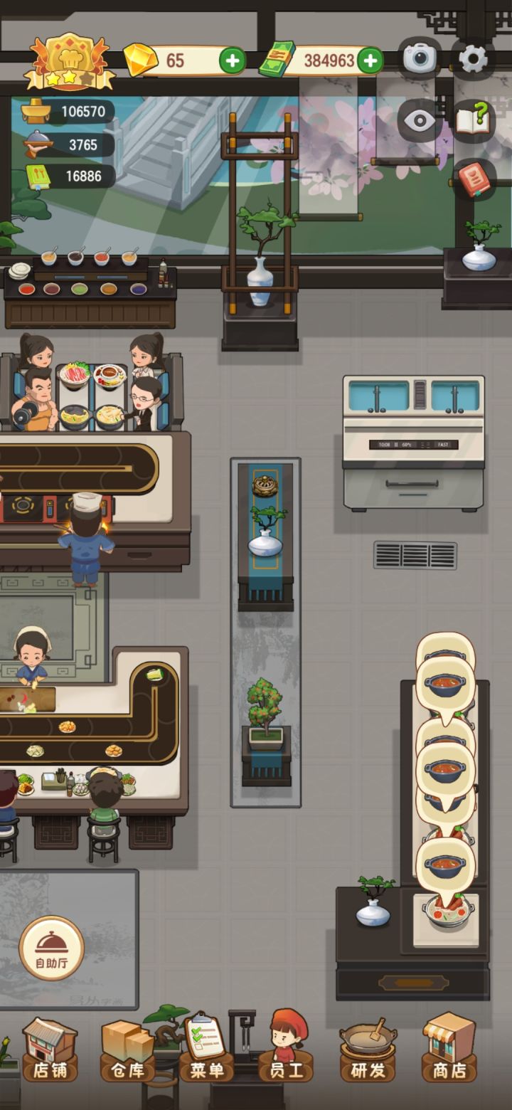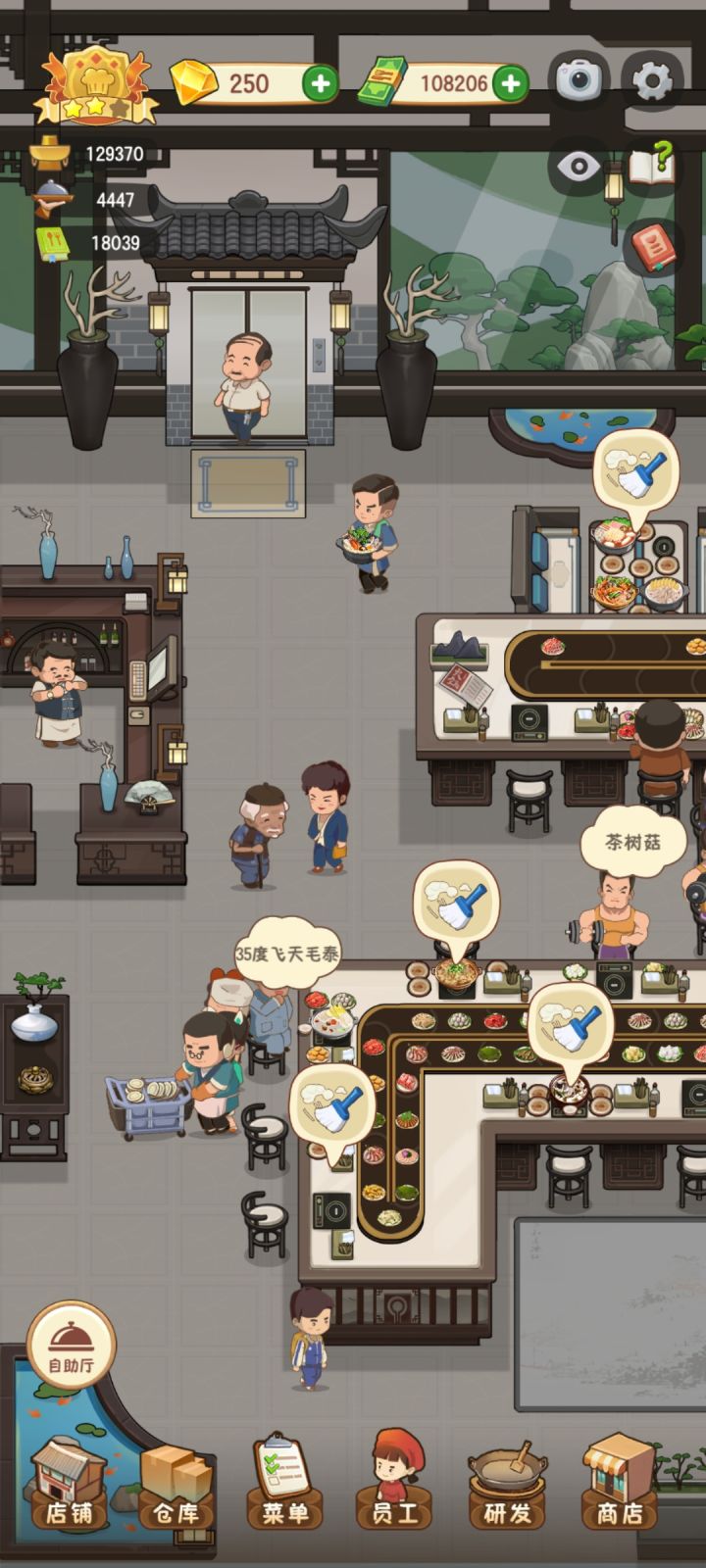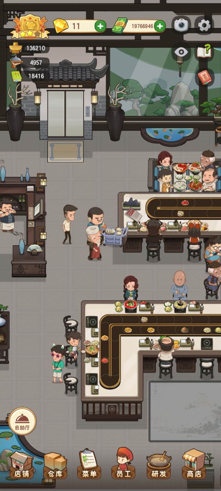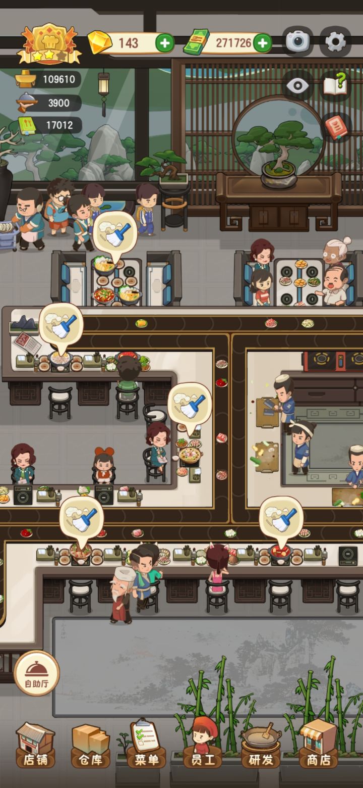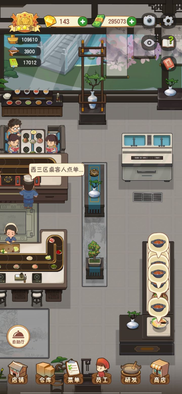 我觉得自助的服务员,逻辑可以改一下,就对着绕圈,一个从左上到右下,一个右上到左下,一个优先卡座一个优先散客就行了,真的看着两个人一起跑然后,一堆扫帚,真的血压拉满!!!!