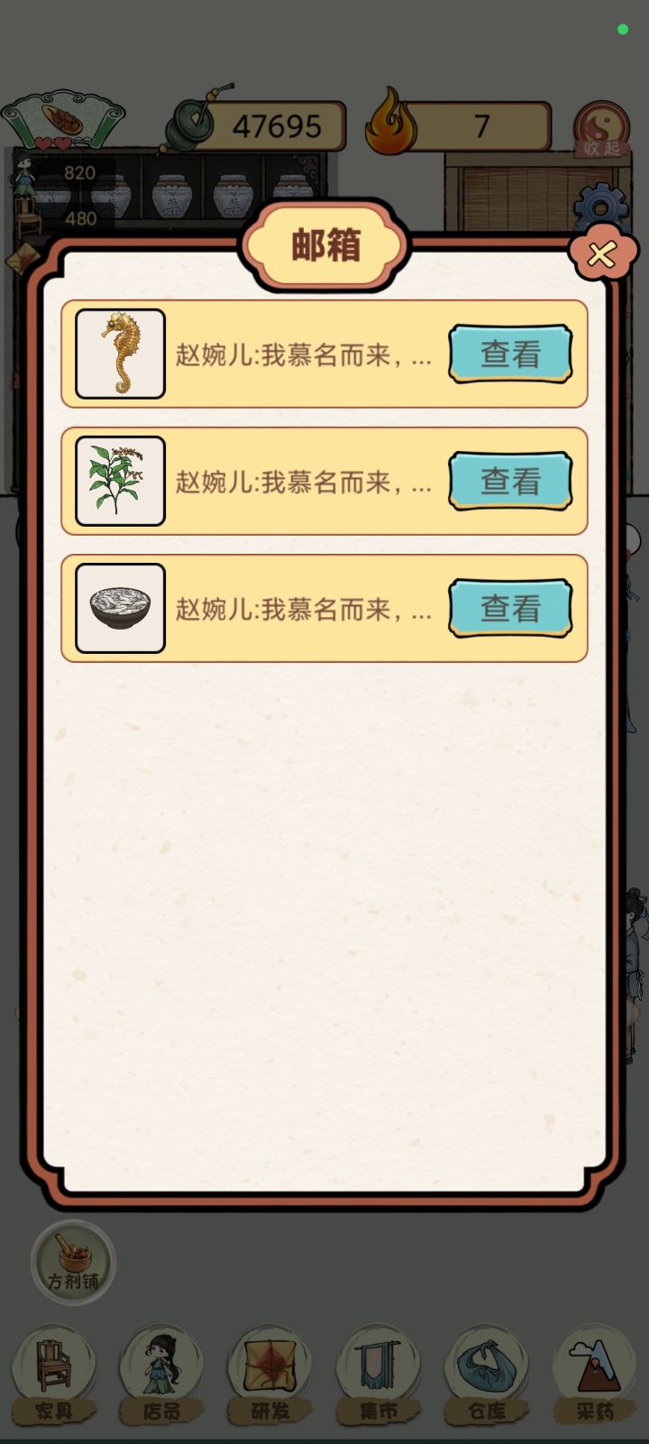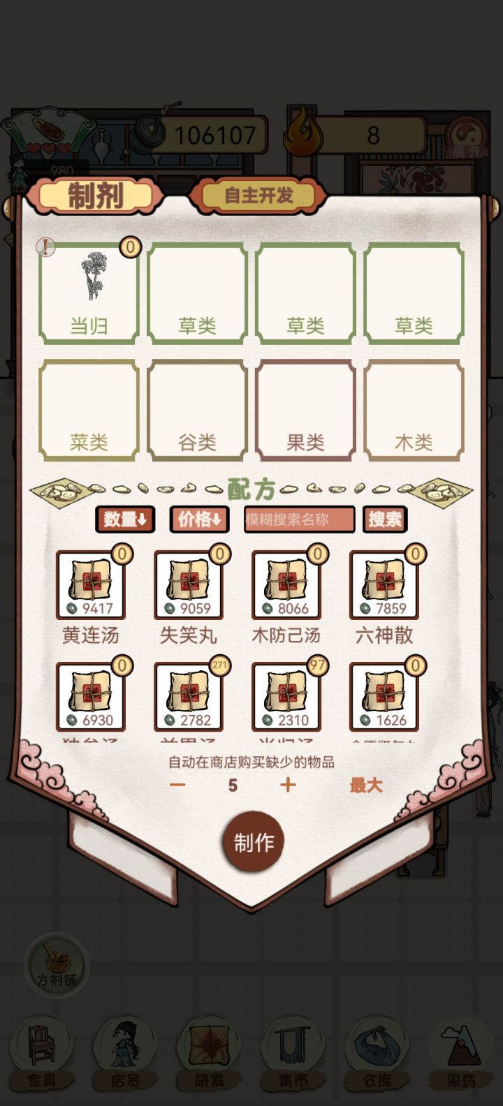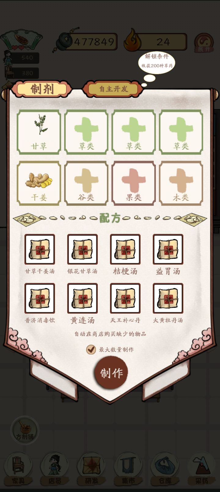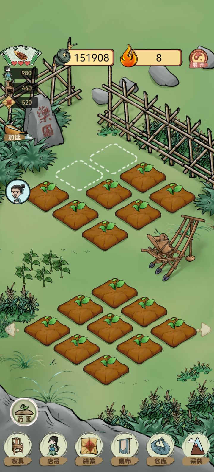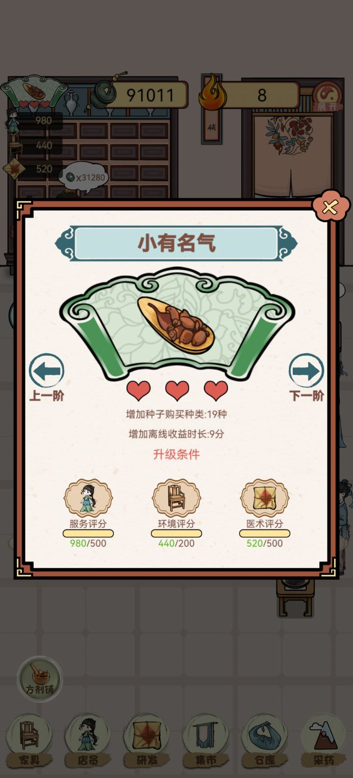 3,已经有点想弃了。这种经营类游戏的关键就在于要看到店铺的慢慢进步啊,就是要完成一个又一个的小目标啊!我每天攒了很多钱也没有地方可以用,就只能不断的增加土地,升级医生,升级招财猫——而且目前看不出来这些升级有什么用处,就连店铺本身的升级都没有什么奖励。我医术评分才520,服务评分都980了,就是说,这个游戏要抽出新药方来实在是太肝太肝了,越往后面积攒出一张新药方的时间就越久,甚至已经超过了我每天能够在手机上花的时间。偏偏熬了那么久抽出来的药方大半都做不了,就是摆着好看的。
