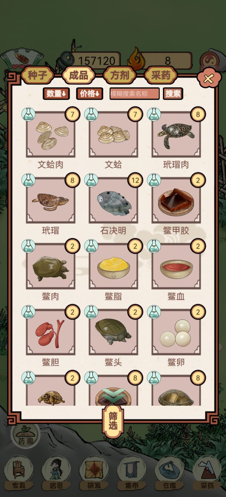 1,前期抽到的诸多药方中大部分都做不了,比如莎草香附子,还有防己,卡住了我好几张药方,集市里买不到,商人买不到,采药也采不到。最常用的赚钱的药方就是益胃汤,当归汤和清震汤,需要的药材比较简单,都能在集市里买到,同时生长周期也比较短。这就导致游戏中期的可玩性变得很差,每天就设定那几种最赚钱的药,一键播种一键采摘,其他的种子就不用买了。