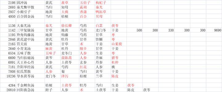 我目前做出来的一些,大家也可以把自己做的发出来实验一下~1.撮风散 钩藤 1652.当归汤 当归 23103.通幽汤 升麻 9244.半硫丸 半夏 干姜(这个买来直接用) 9475.苦酒汤 半夏 7396.玉女煎 知母 6937.清燥汤 黄芪 11088.丹参汤 丹参 2319.除痹汤 甘草 苍术 泽泻(不知道从哪里来) 茯苓(砍树) 126510.益胃汤 沙参 玉竹 麦冬门