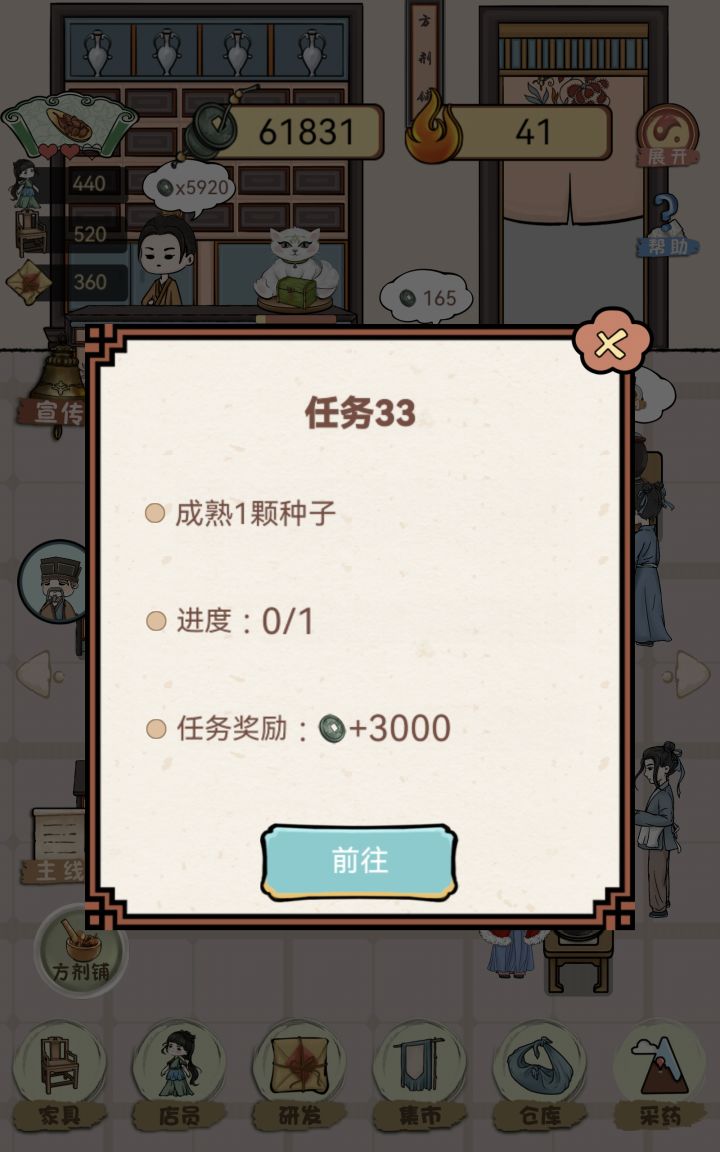 中药铺子很佛系的挂机游戏,如果想要加快进度就多看看广告,不然就挂机。跟着任务指引做完了,建议先开菜地,开到9格菜地就可以满足基本供需了,后面的其实不着急开(我开了,种的东西前期也用不太到)种子不用屯,用到什么买什么,把钱花到刀刃上。郎中每样请一个,升级可以提高挂号费。店铺的设施前期不用着急升级,主要开一下马车和招财猫就行,其次是药罐,可以加快熬药速度,你也看那里排队多,升级哪里。建议先攒钱