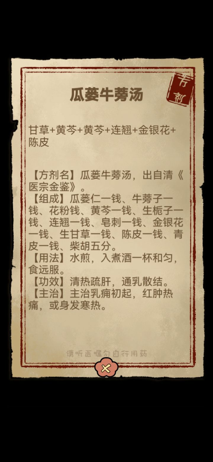 致富之路给大家找了一个致富的药方😆甘草有吧,金银花有吧,黄芩连翘能买到吧,陈皮找果子那一栏种橘子收获了就有大量陈皮。就这样简简单单的药材来源,一份可以卖一万六,平均一波广告就能产生两百万的营业额,这不致富谁致富?😍如果没有此药方 没有关系! 升级绵绵到满级,药材充足她会自己做出来