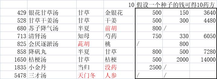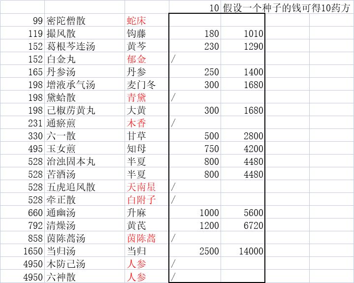 假设从集市买了种子种下去,收获十份(实际收获因为各种加成,肯定比10多),可制作十个方剂的情况下,计算出的净利润。当归汤1650,只需要当归,集市可买,是目前我的方剂里面只要一种草药最赚钱(净利润14000+)桔梗汤1650,甘草+桔梗(净利润14000+)鸡鸣散19668,桔梗+生姜+槟榔(净利润190580+)(继六一散被砍后最赚钱的存在,但是需要种植时间长,要草药地+生姜+果地)