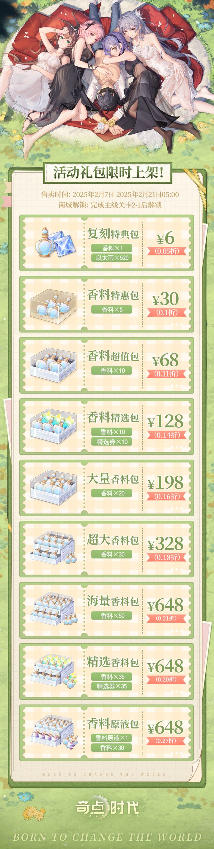 >>>活动时间2025年2月7日-2025年2月21日05:00>>>开启条件完成主线关卡2-7后解锁>>>活动说明五人成行限时复刻!商城礼包同步上新!·每日可领取「以太币」x100与「灵感」x100·消耗「以太币」或「香料」可进行一次转盘!转盘奖励包括「万能香水」「祈愿核晶」「随机五星卡牌」「随机四星卡牌」「灵感宝藏」「随机香水」「精选券」「抽奖券」「以太币」。·累计转盘次数更可