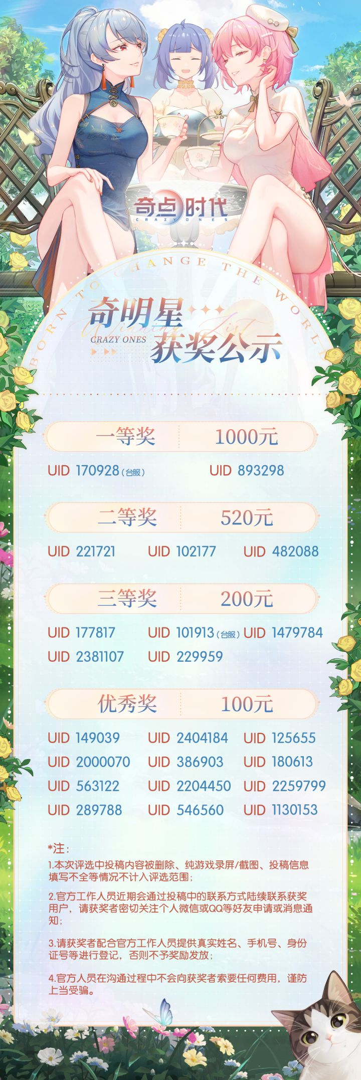 经过官方评审团的慎重评选,奇明星创作活动结果公布!在本次创作活动中,我们收到了许多优秀的投稿。感谢每一位精心准备的作品,也感谢所有积极参与互动的Crazyones~※获奖详情请查看下方图片。再次感谢大家的热情参与!获奖者将由官方人员添加联系方式收集相关信息,并在15个工作日内发放。#奇点时代 #同人
