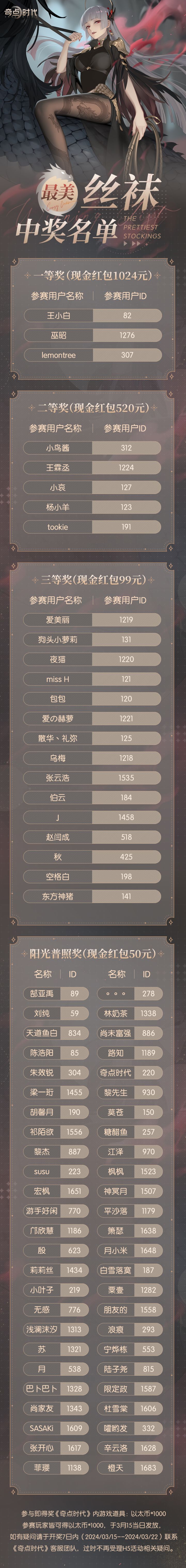 Hello CrazyOnes,感谢各位对《奇点时代》龙年最美丝袜评选H5活动的大力支持与参与!本次活动我们收到了来自五湖四海带着味儿的“丝袜狱卒”,惊喜地发现我游存在众多美腿“纤细柔美型”“粉嫩肉感型”“雪白修长款”... ...还有少量抽象的“劫匪款”“兄弟型”... ...在龙年限定夏冰同款丝袜个人秀竞赛中,好几双婀娜多姿、曲线曼妙的美腿脱颖而出,斩获了千元、五二零等现金大奖!中奖